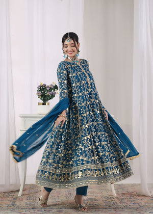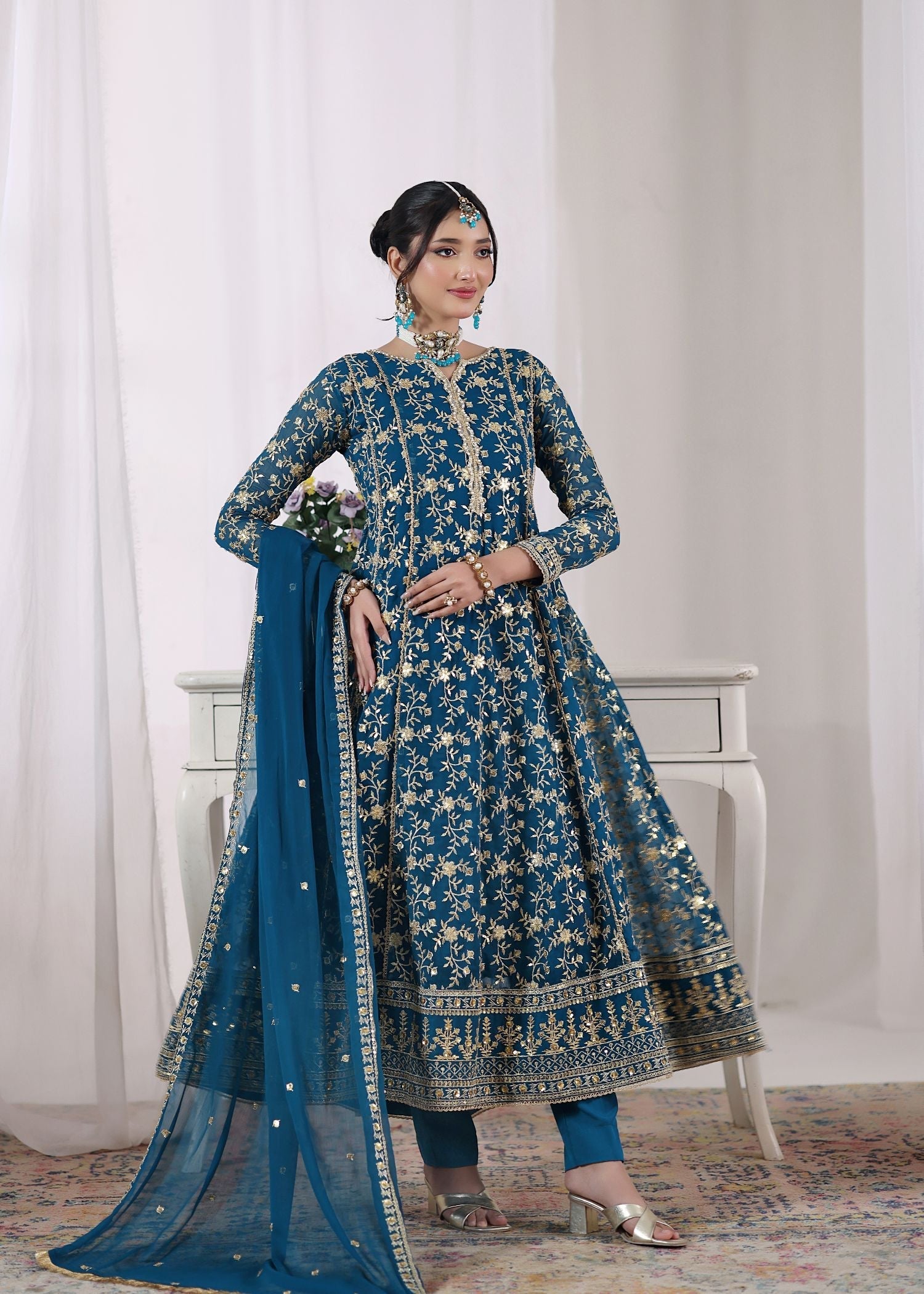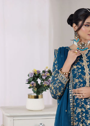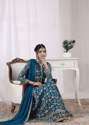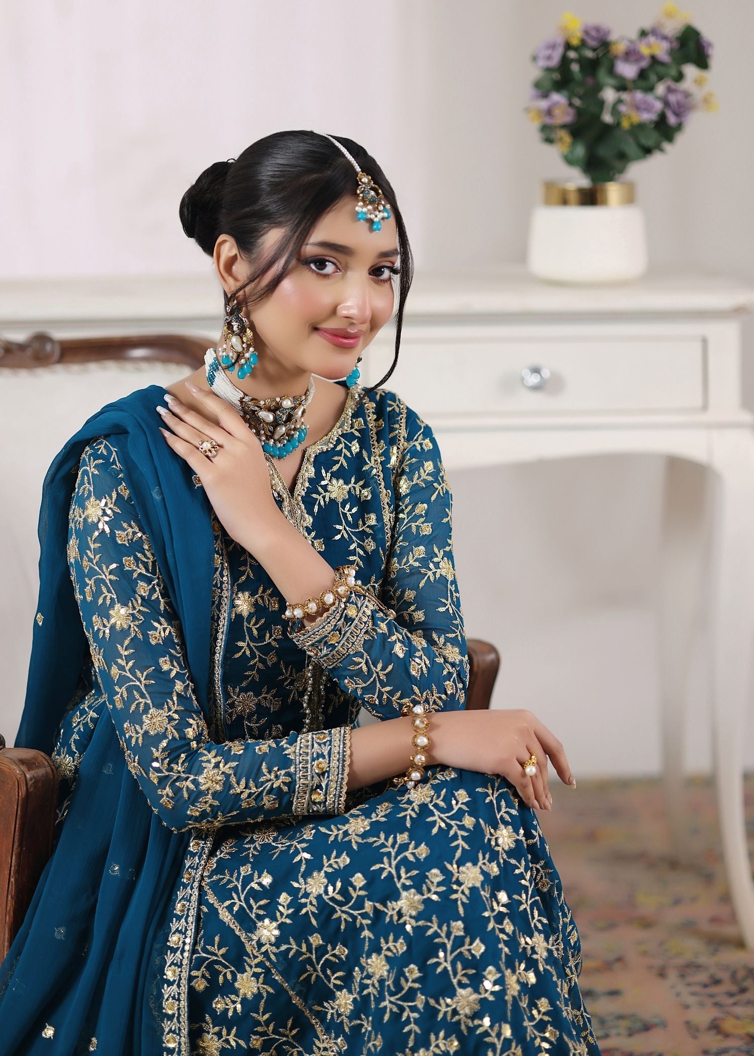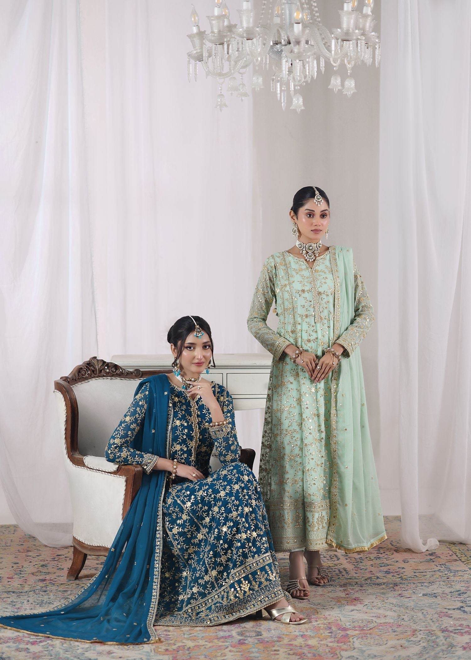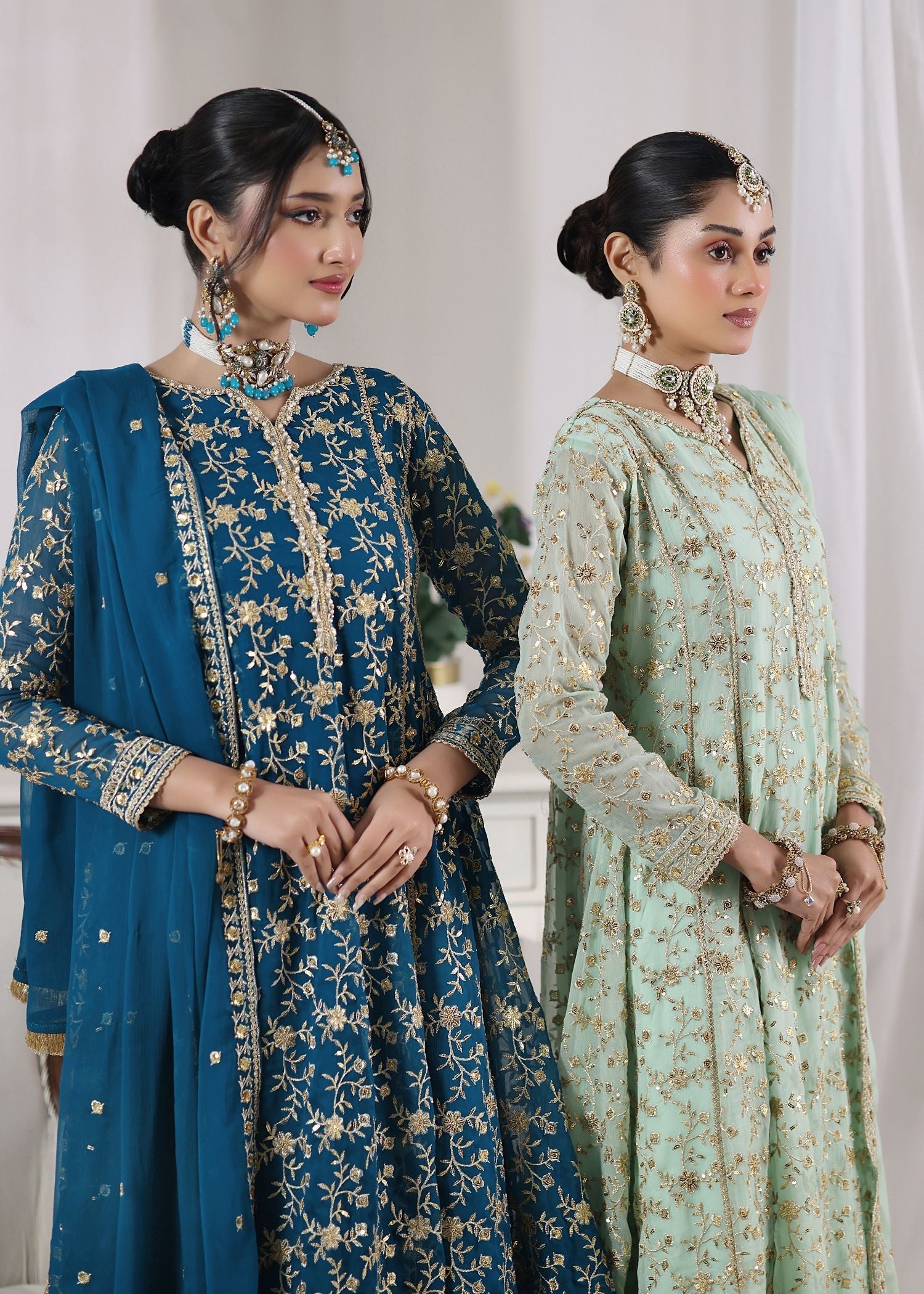 This exquisite flared Pishwas set in elegant peacock chiffon features intricate embroidery, slim-fit top, and cigarette pants. The 3-piece ensemble includes a chiffon dupatta and crepe lining. Perfect for festive occasions, the Al-Harir Apparel ensemble exudes grace and sophistication.