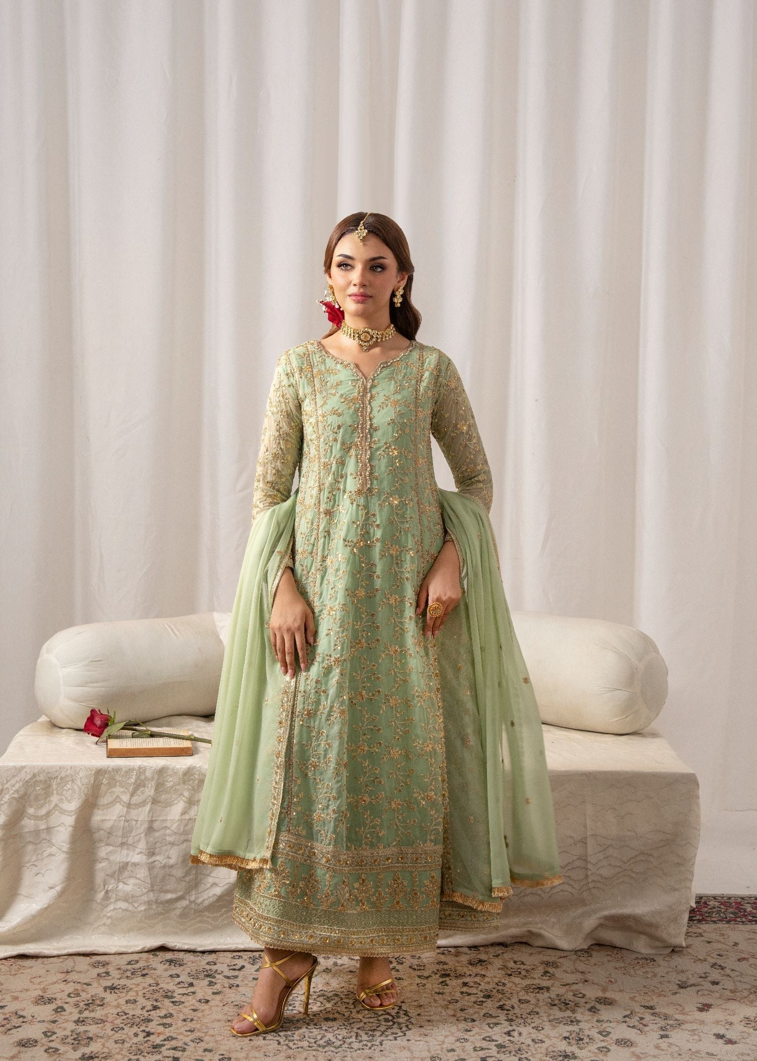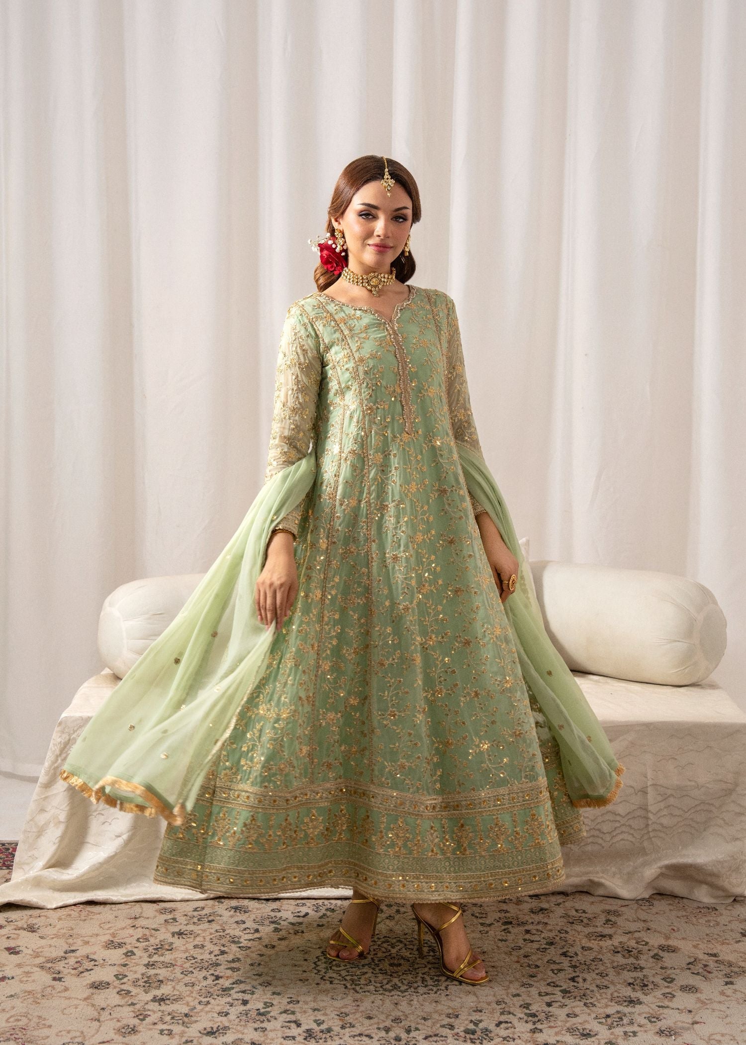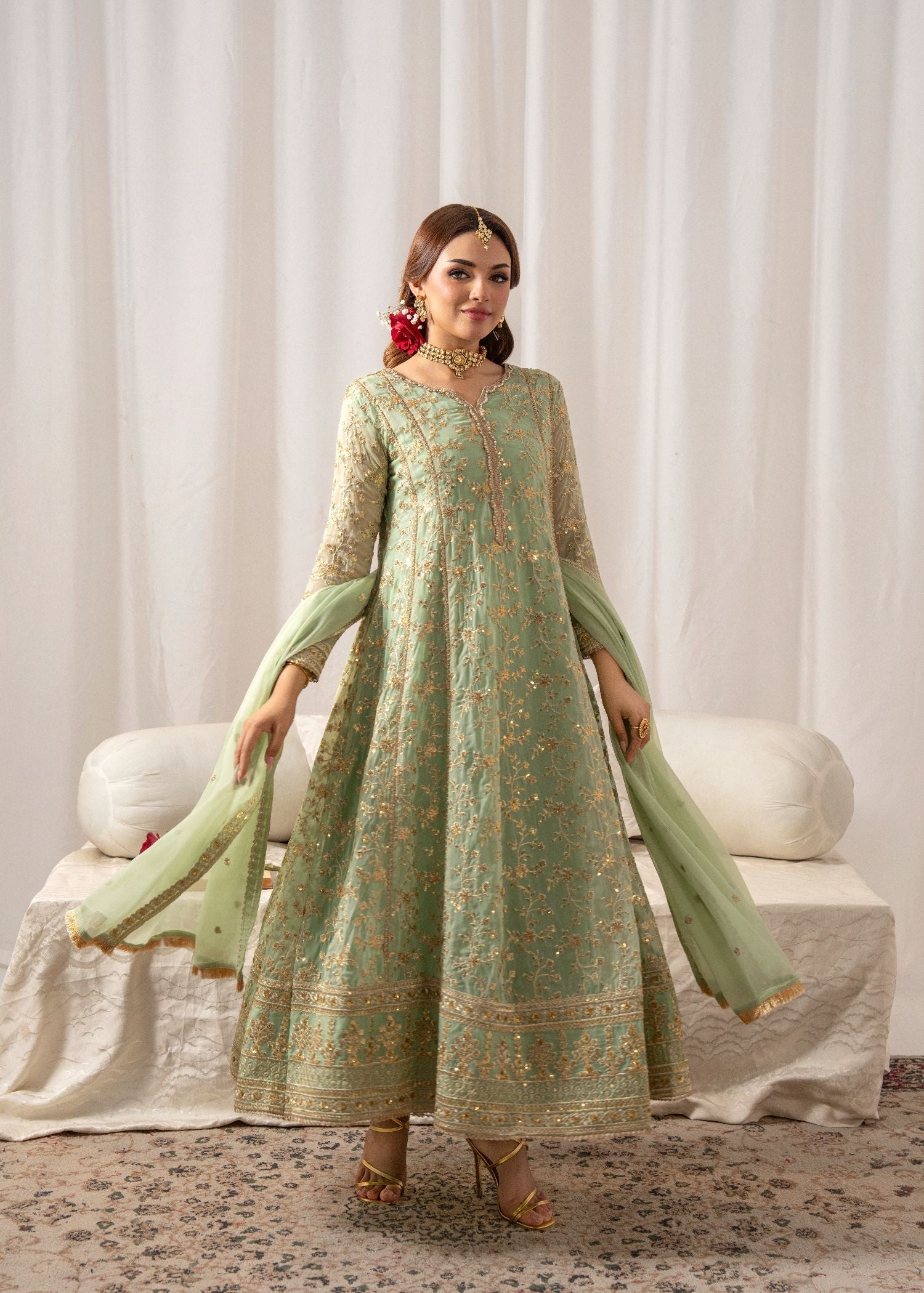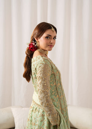 This exquisite flared Pishwas set in elegant Angoori chiffon features intricate embroidery, slim-fit top, and cigarette pants. The 3-piece ensemble includes a chiffon dupatta and crepe lining. Perfect for festive occasions, the Al-Harir Apparel ensemble exudes grace and sophistication.