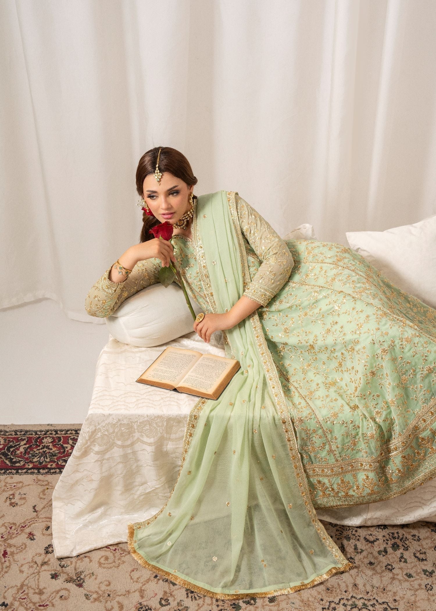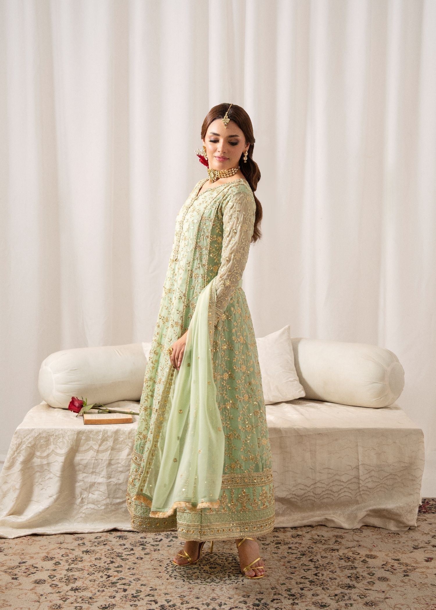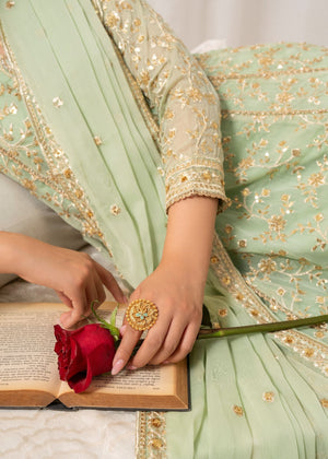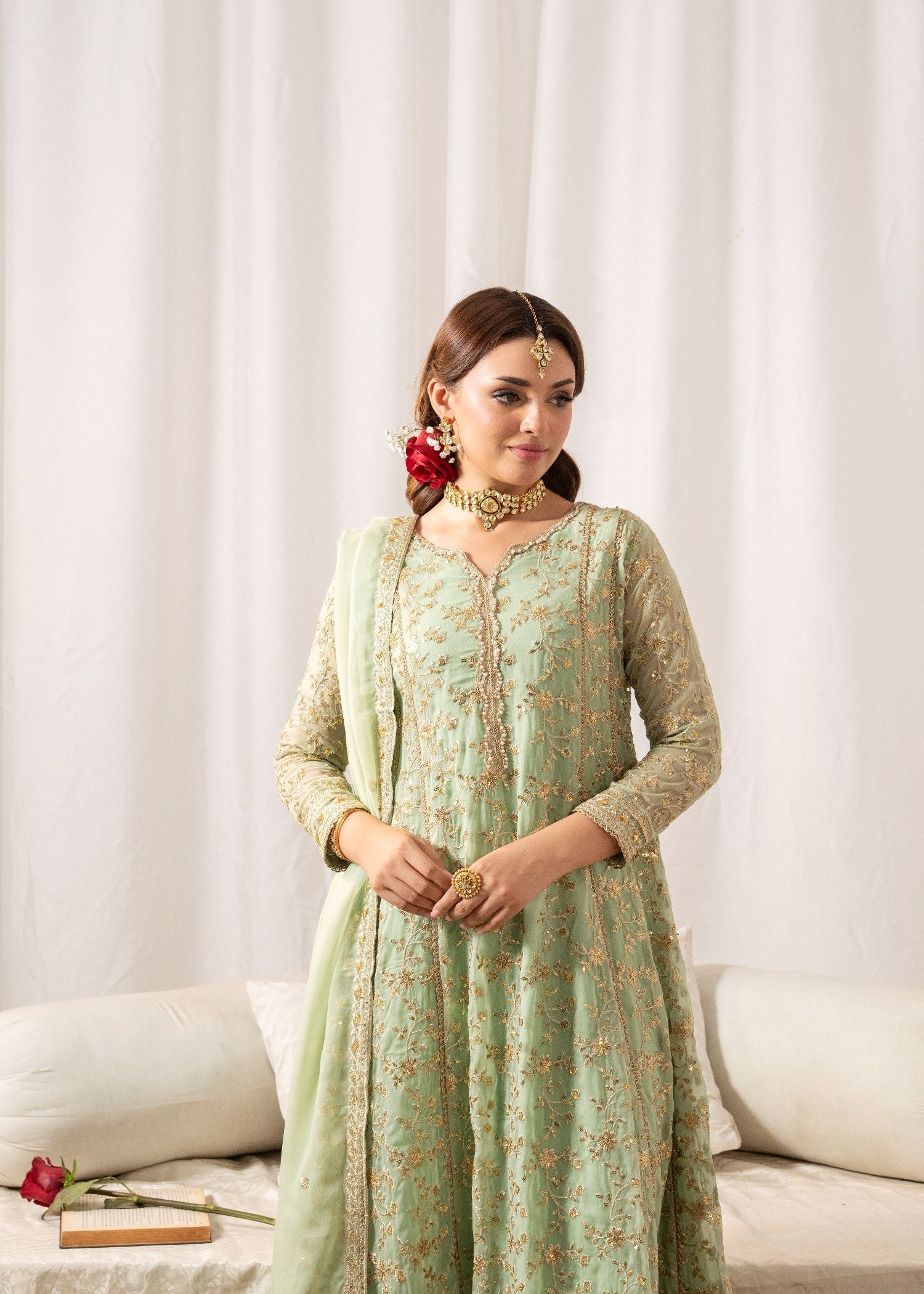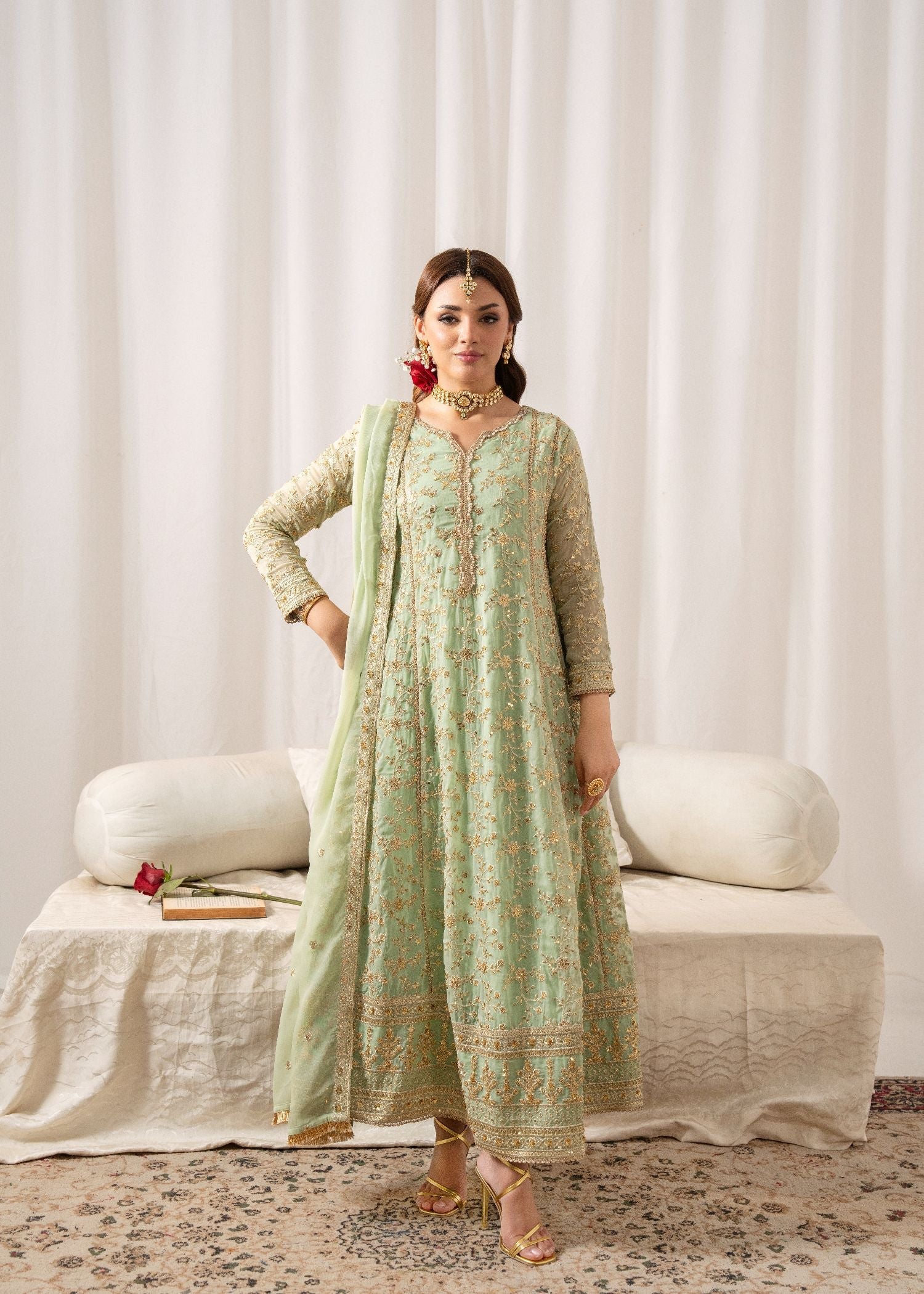 This exquisite flared Pishwas set in elegant Angoori chiffon features intricate embroidery, slim-fit top, and cigarette pants. The 3-piece ensemble includes a chiffon dupatta and crepe lining. Perfect for festive occasions, the Al-Harir Apparel ensemble exudes grace and sophistication.