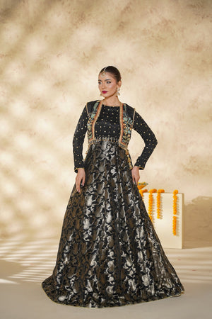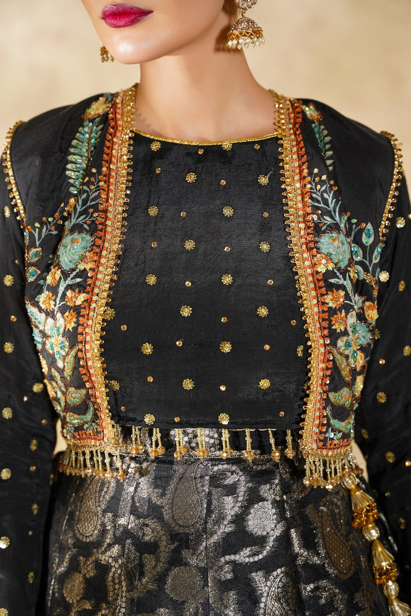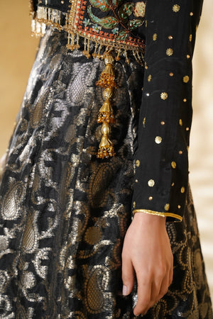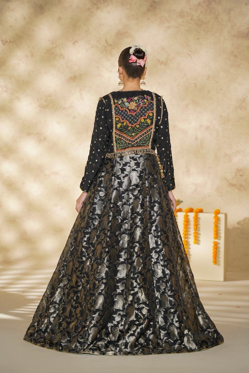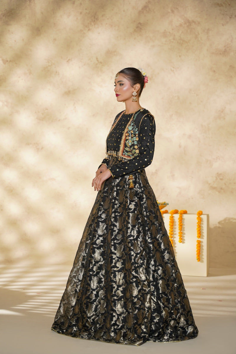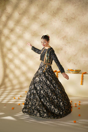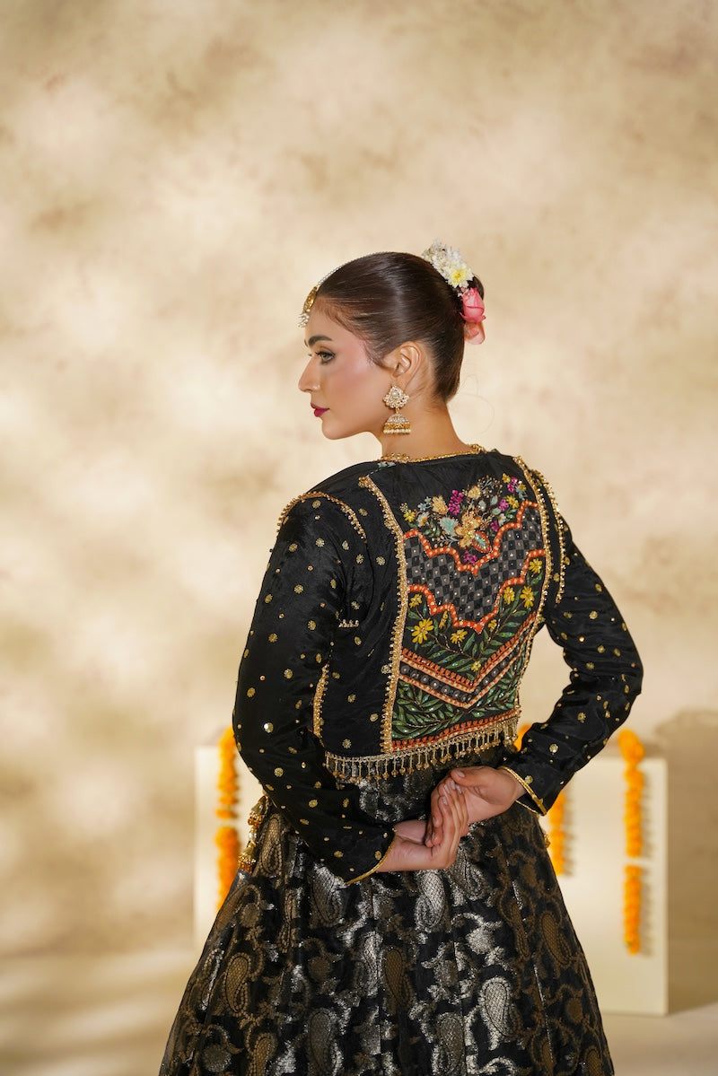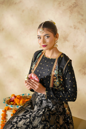 A graceful black lehnga ensemble featuring a silk blouse adorned with delicate embellishments, layered with a separate handcrafted jacket showcasing intricate adda work. Paired with a pure Banarsi lehnga, Chandni radiates timeless elegance and festive charm, perfect for special occasions.