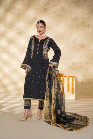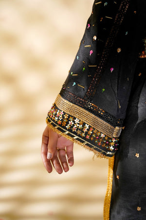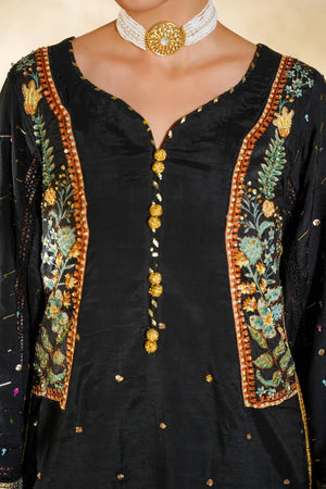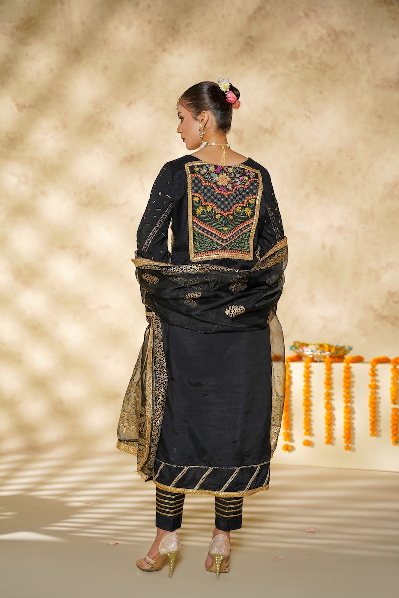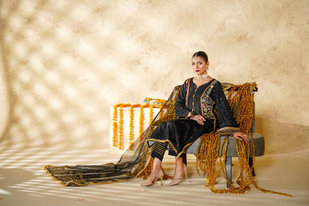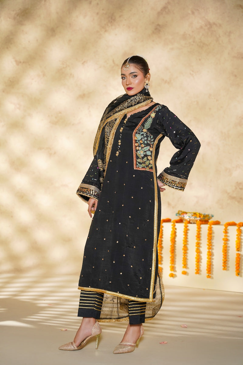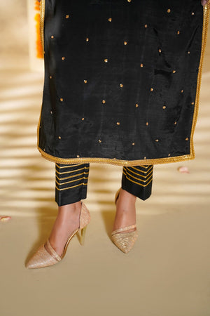 A stunning black ensemble crafted in slub raw silk, featuring a long shirt with delicate embellishments and handcrafted adda-work in an attached jacket-style body design. Paired with straight trousers adorned with gota lace at the hem and a block-printed dupatta with handcrafted adda-work on the upper back, Zeenat radiates timeless desi elegance, perfect for festive gatherings and special occasions.