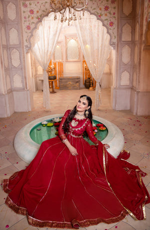 . It Comes With Red Chiffon Dupatta, Heavily Embellished With Lappa And Gotta Work, Which Makes This Signature Piece Stand Out The Crowd.