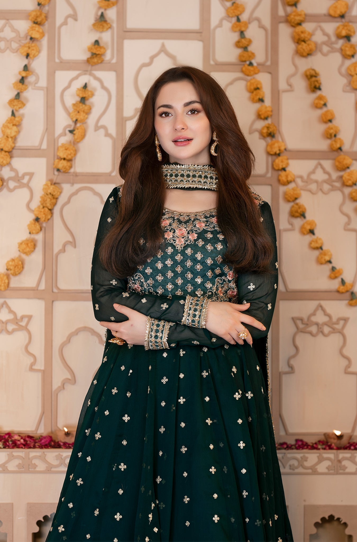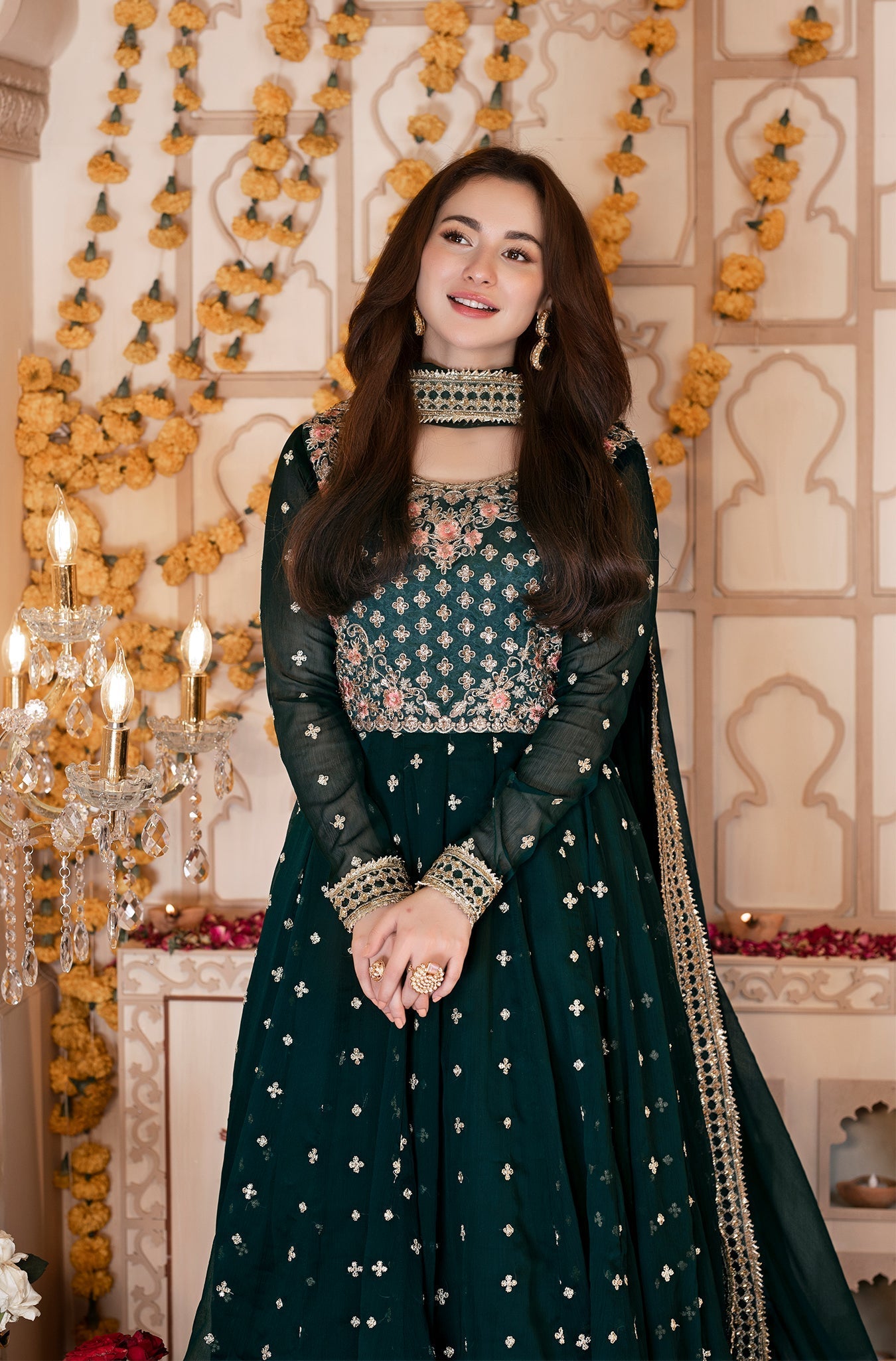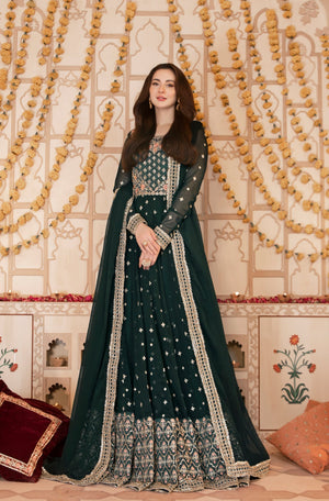 Introducing our exquisite Bottle Green Heavily Embroidered Frock,The rich bottle green hue exudes sophistication and is perfectly complemented by the equally beautiful Embroidered Dupatta. Designed with an attached inner, this frock ensures a seamless and comfortable fit, allowing you to move with grace and confidence. a masterpiece of timeless elegance. This stunning ensemble is crafted with meticulous attention to detail, featuring intricate embroidery that adorns the entire frock.