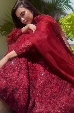 The classic, the modern, the glamorous or the unconventional. Delicately Crafted Deep Maroon Organza Pishwas engraved with intricate details and delicate embroidery work on every panel with an organza dupatta that has exquisite embroidery borders makes it a statement attire for the next festive season.