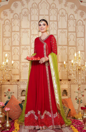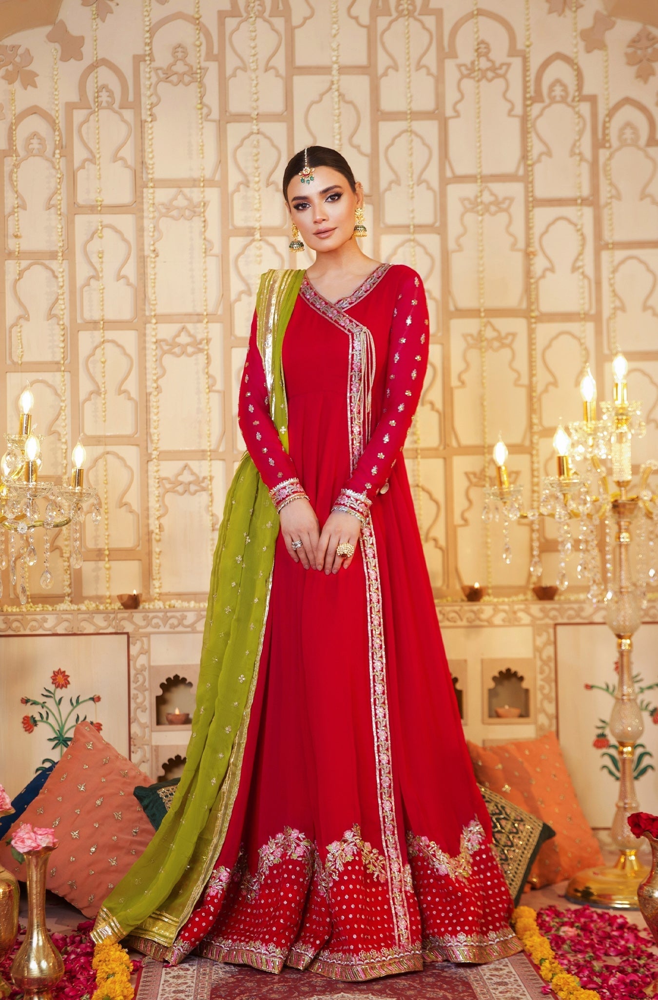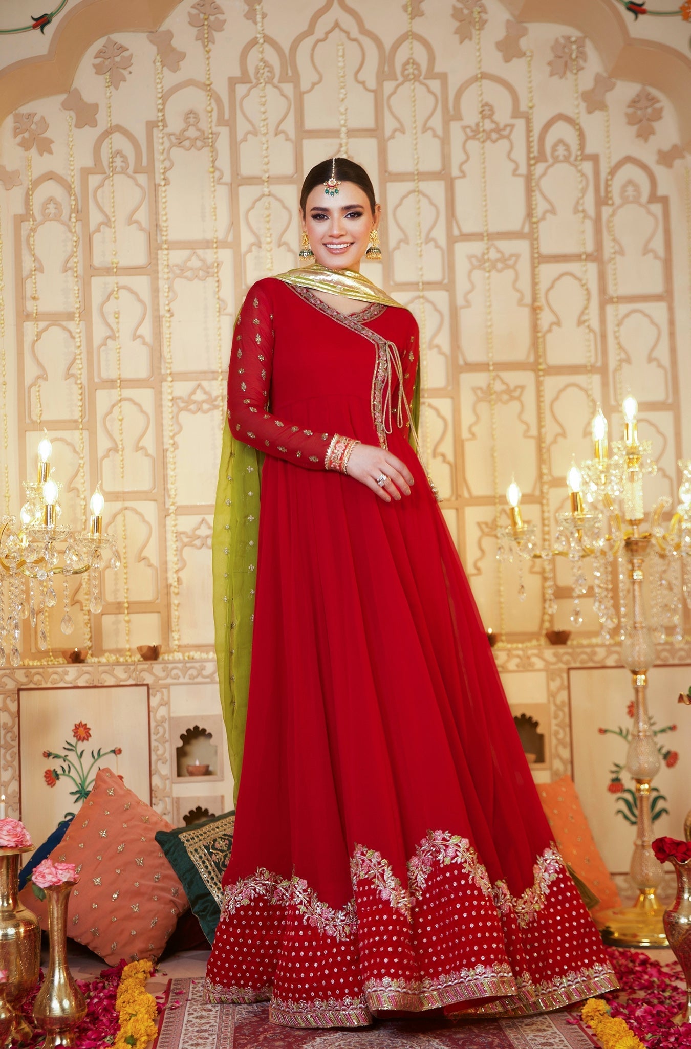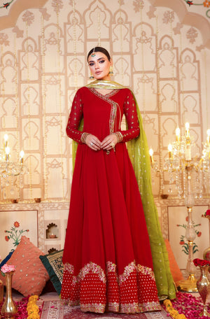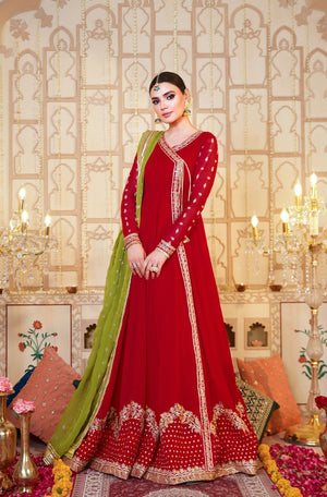 Step into a world of grace and sophistication with our Ruby Red Embroidered Chiffon Frock. The vibrant red hue complements the parrot green dupatta, creating a striking combination. Embellished with delicate lace detailing and designed with an attached inner, this ensemble captures attention with its traditional charm and elegant appeal.