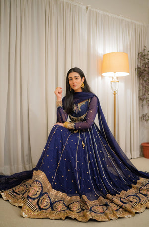 . This Kalidar is crafted with sequins, zari and Resham embroidery on chiffon fabric. (Stitched With Inner Attached, And paired with Embellished Chiffon Dupatta for Eastern Queen Touch