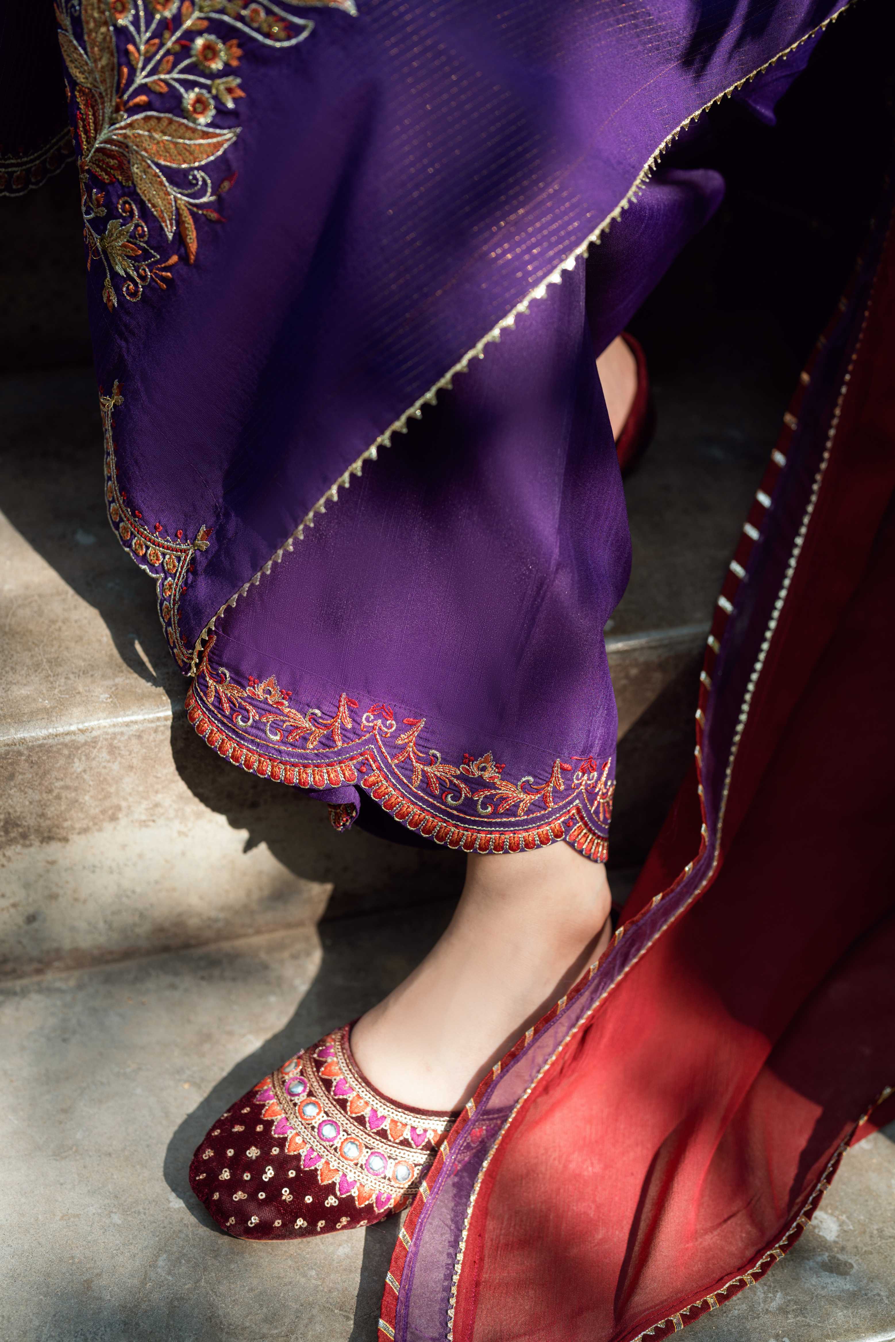 Shirt: Purple cotton susi long A-line shirt with scallop embroidered hem and embroidered bunches on daman. Embroidered neckline with rust accents and color pop on sleeves. Embroidered pockets finished with gota details.