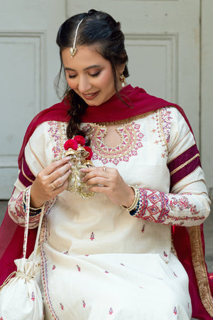 Dupatta: Contrasting hot pink chiffon dupatta with kiran and gota details.