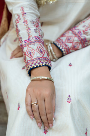 Shirt: Off white cotton susi straight long shirt with body cut, key hole embroidered neckline and sleeves with Rajasthani-inspired fabric manipulation, embellished with gota details.
