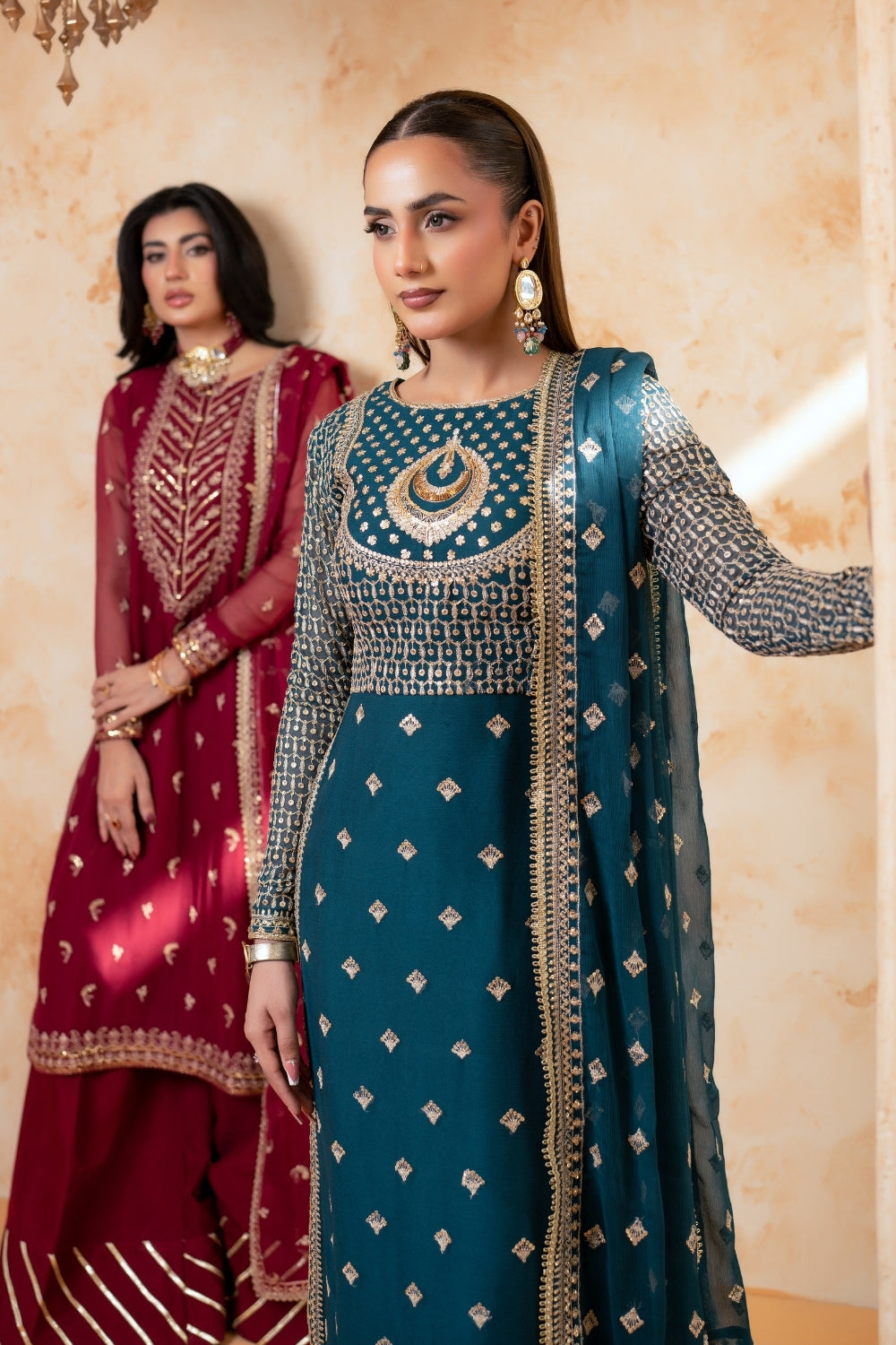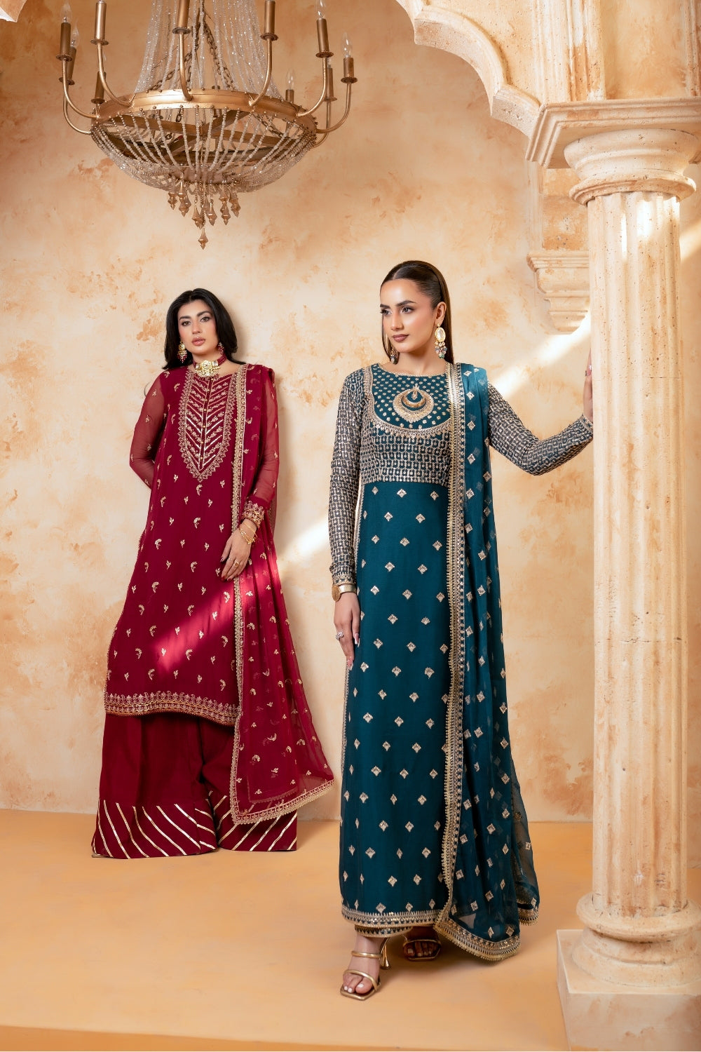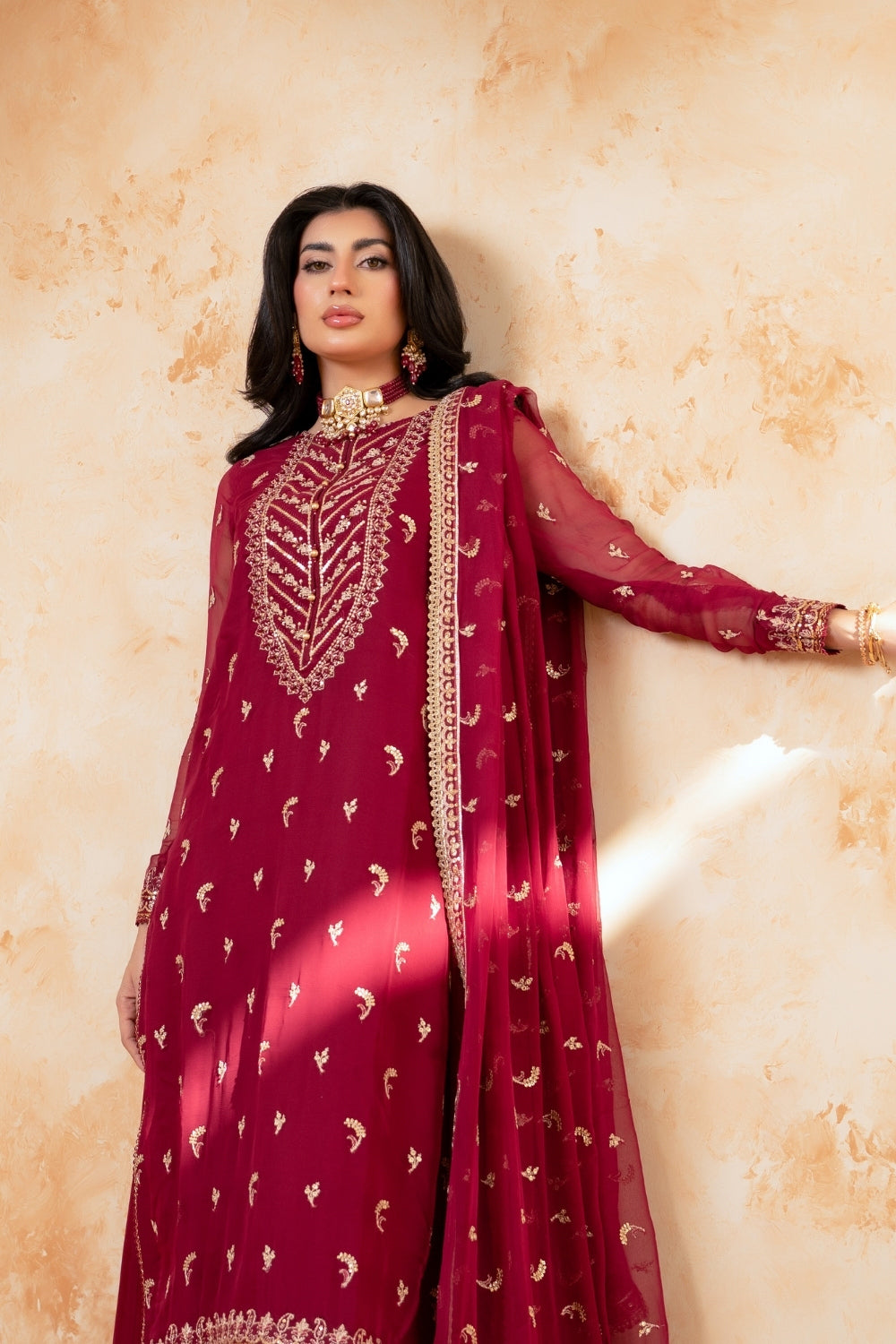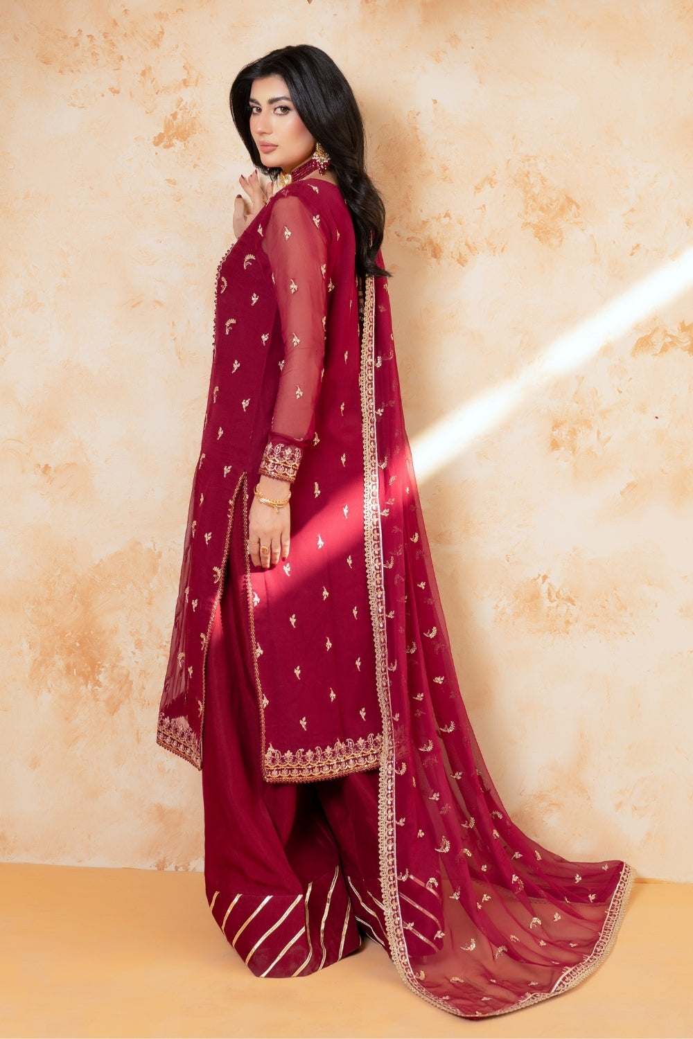 A rich maroon ensemble featuring intricate gold embroidery on the neckline, sleeves, and hem, accented with delicate motifs throughout, paired with plazzo pants and a matching dupatta.