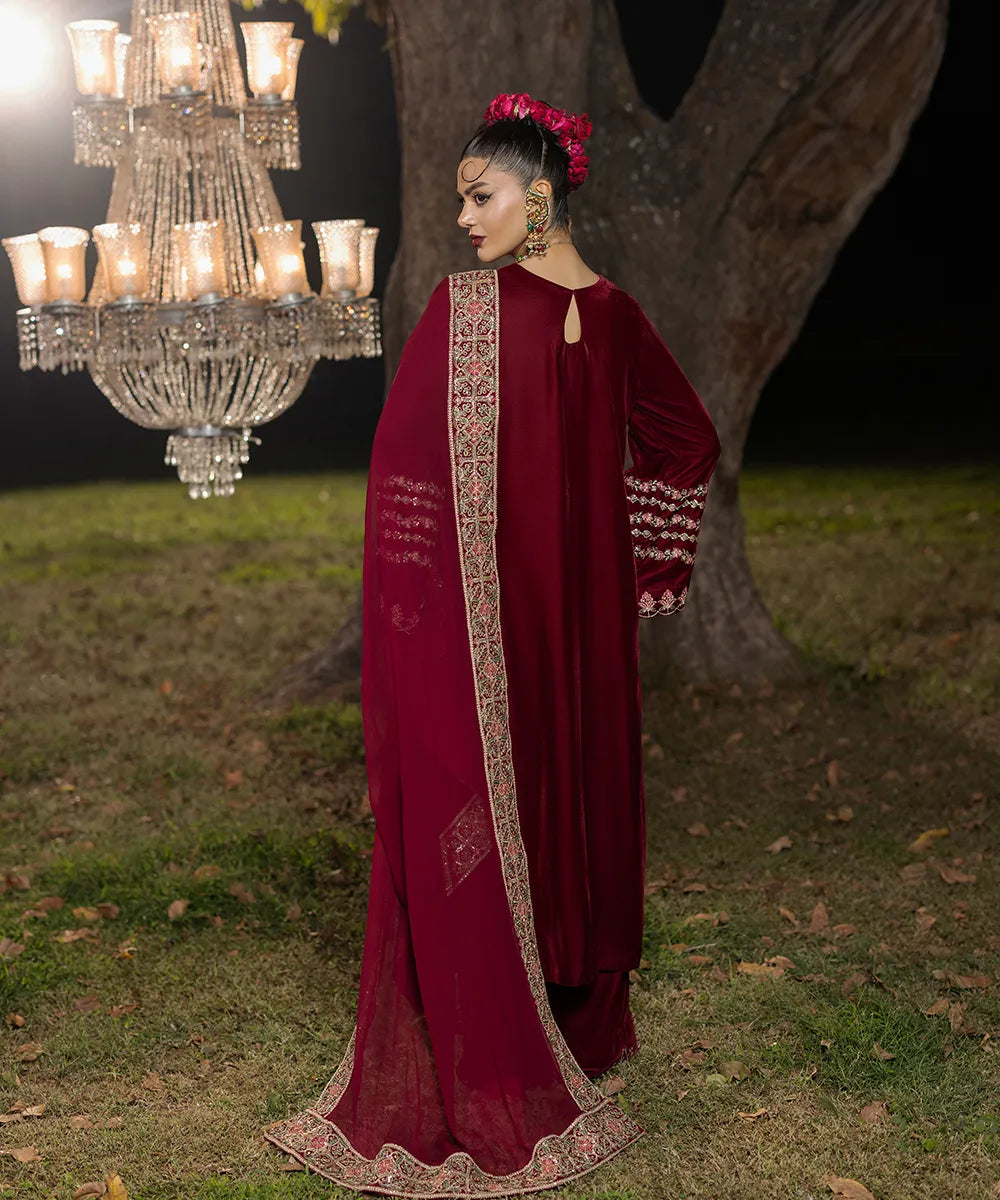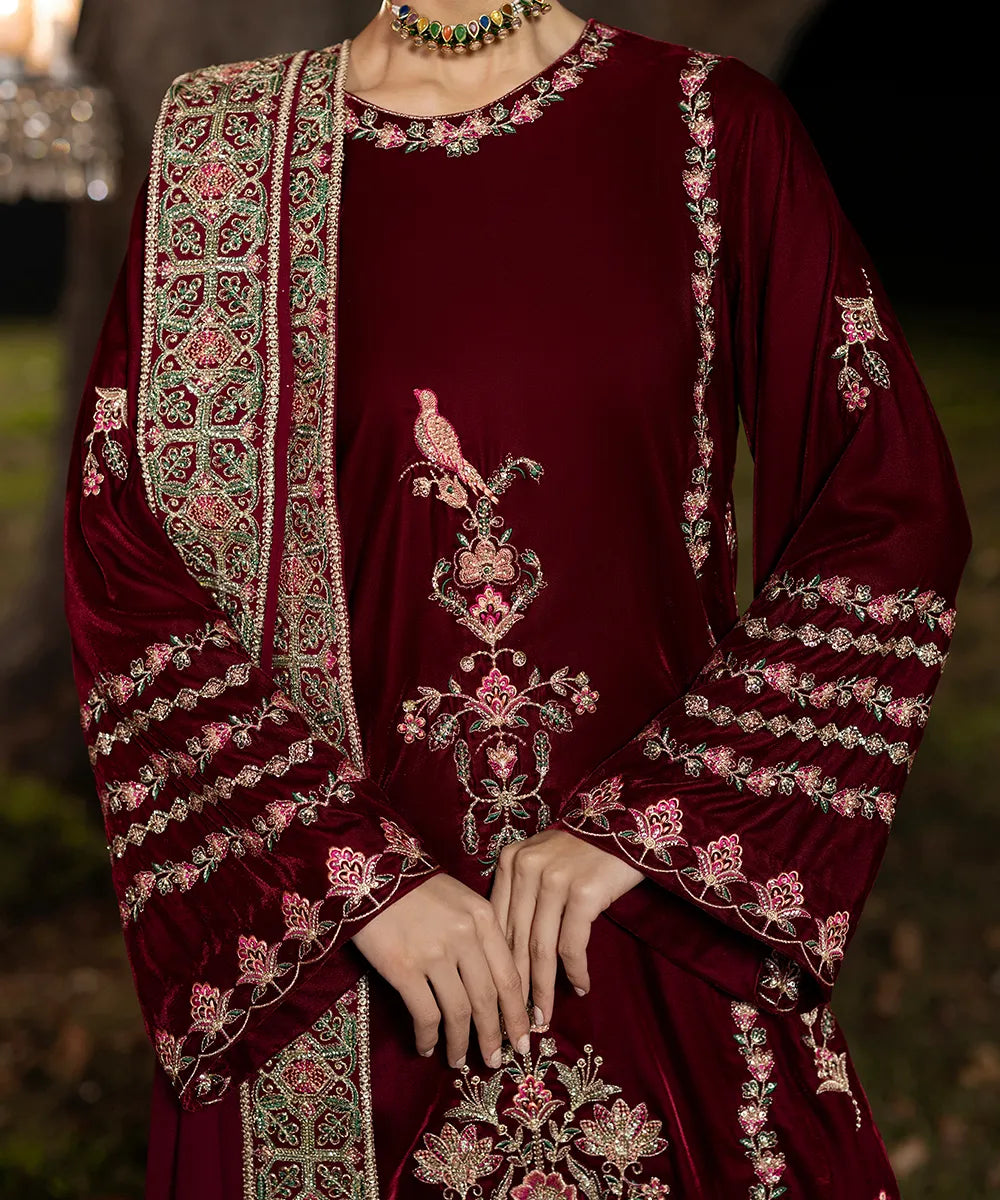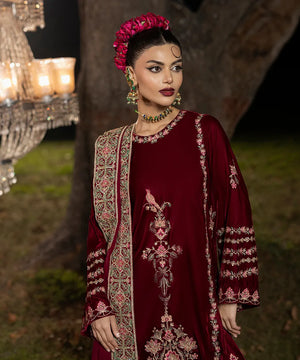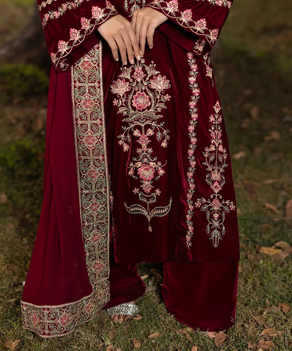 A maroon canvas in luxury velvet serves as a base to meticulously designed embroidery on the neckline and sleeves. The front has vines running down from the shoulder with gold sequins. It is paired with a velvet straight trouser and embroidered dupatta in maroon.
