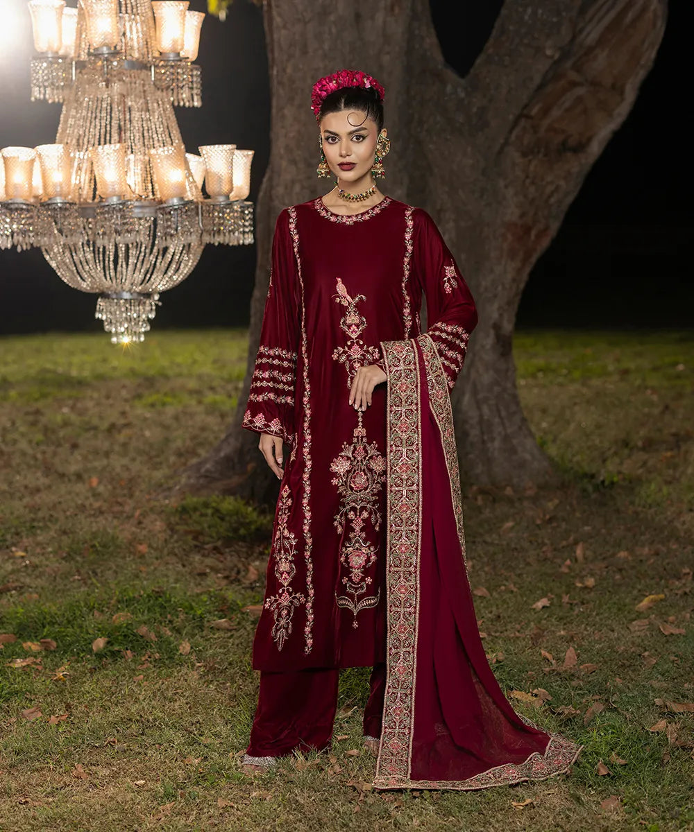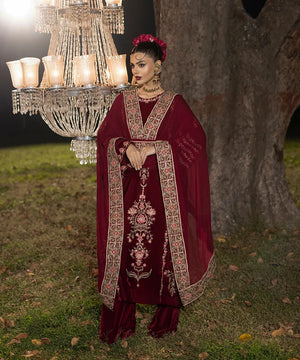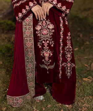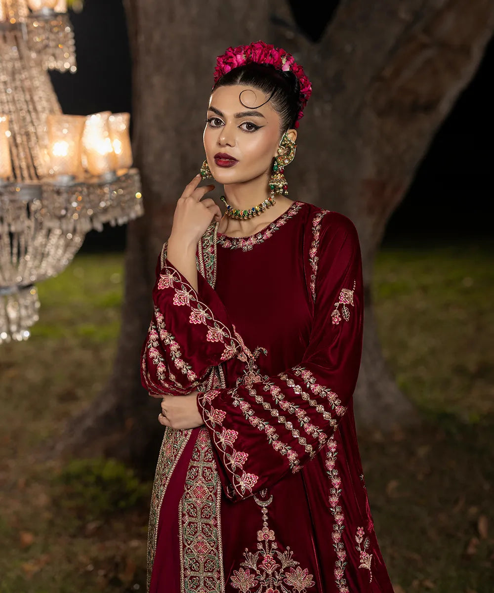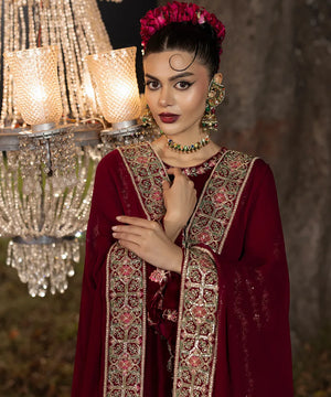 A maroon canvas in luxury velvet serves as a base to meticulously designed embroidery on the neckline and sleeves. The front has vines running down from the shoulder with gold sequins. It is paired with a velvet straight trouser and embroidered dupatta in maroon.