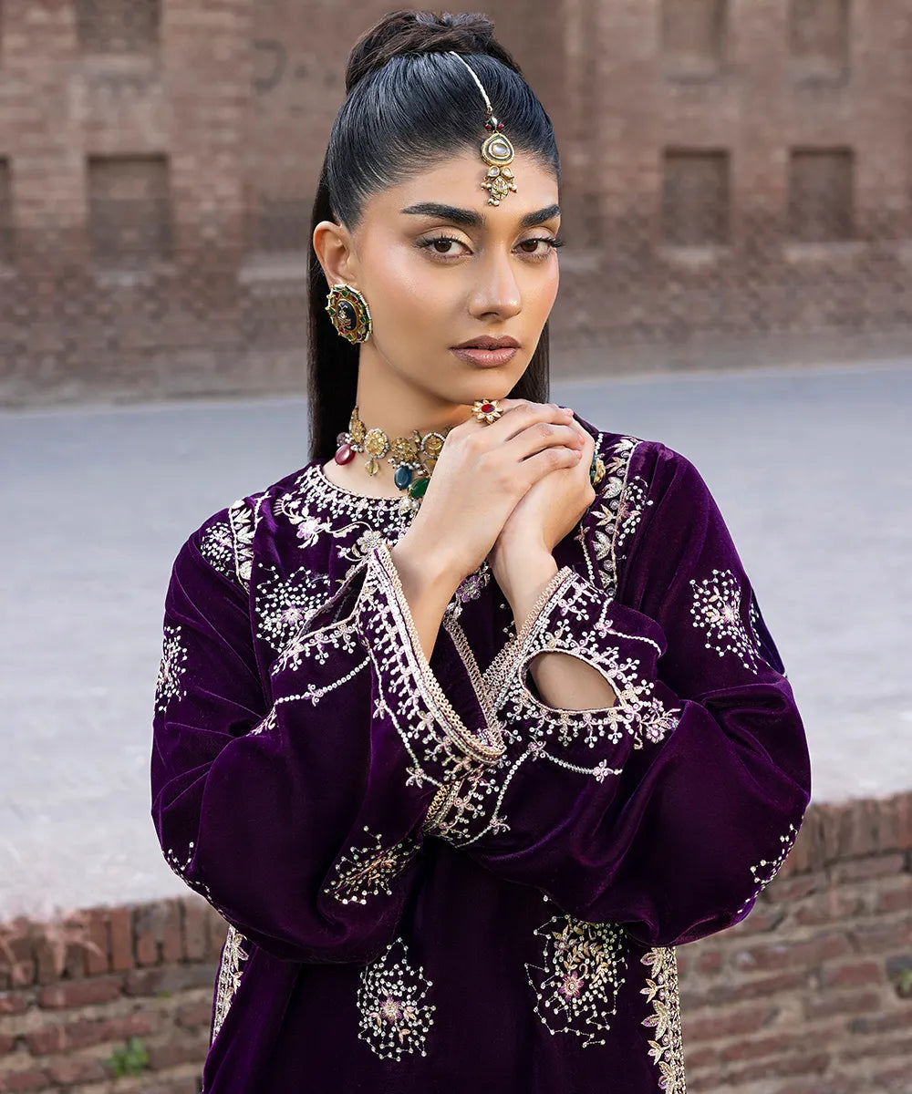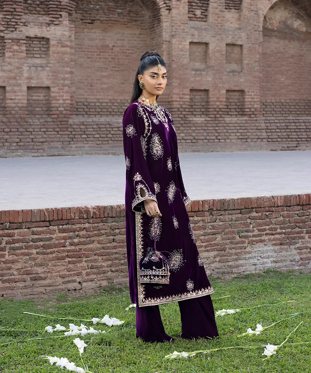 A plum canvas in luxury velvet serves as a base to meticulously designed embroidery on the neckline, sleeves and side borders.  The Front has an intricate spray of sequins in gold and is paired with a velvet straight trouser in plum.