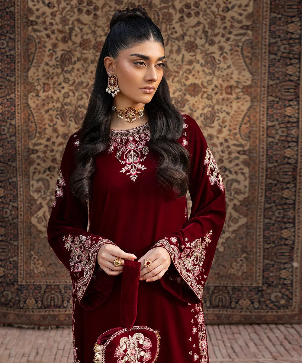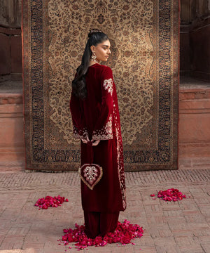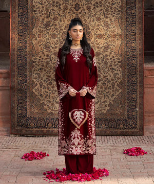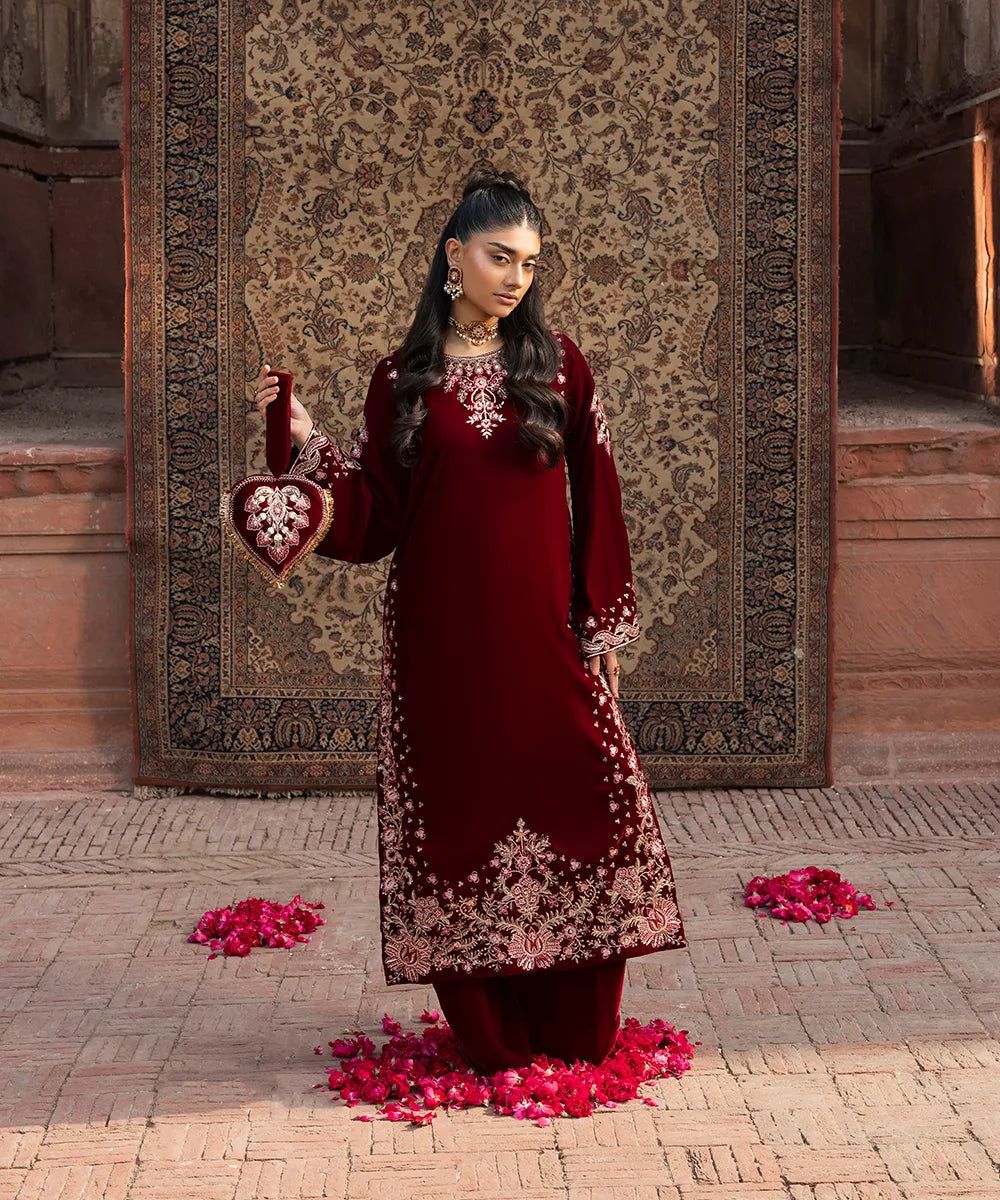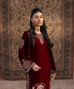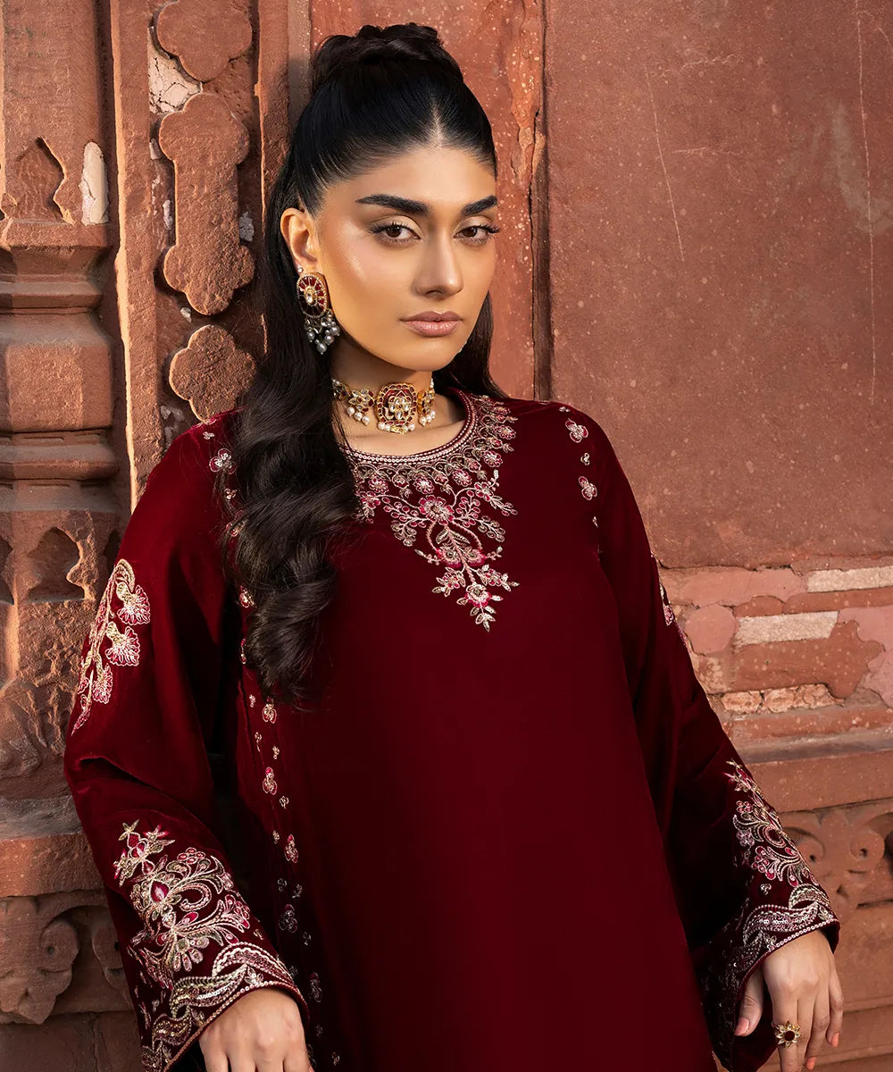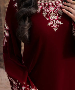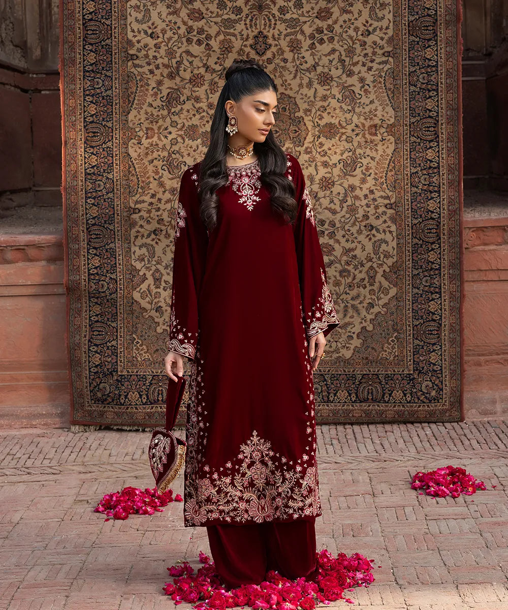 A maroon canvas in luxury velvet serves as a base to meticulously designed embroidery on the neckline, sleeves and side borders. The multi-colored threads are adroned with gold sequins. It is paired with a velvet straight trouser in maroon.