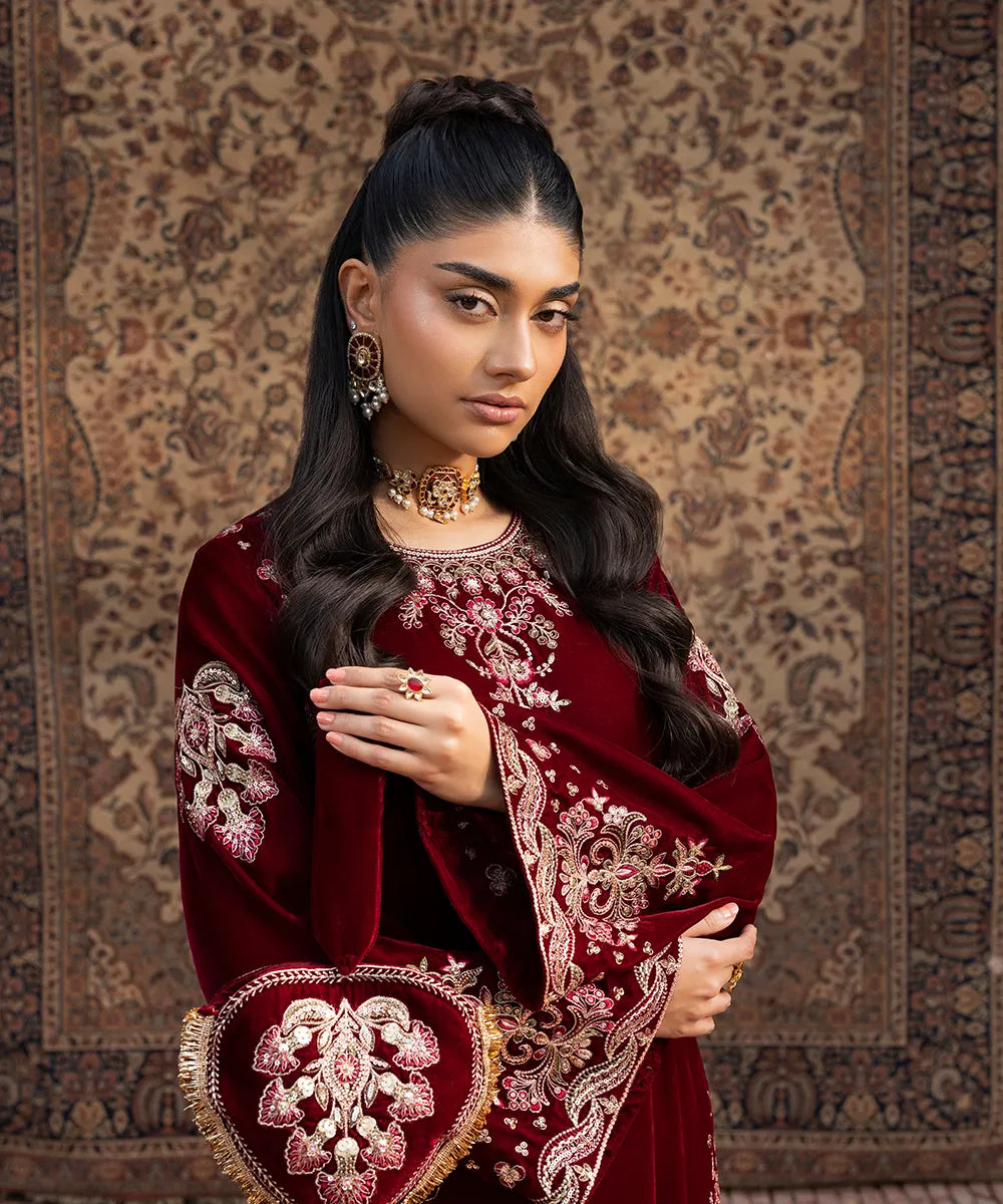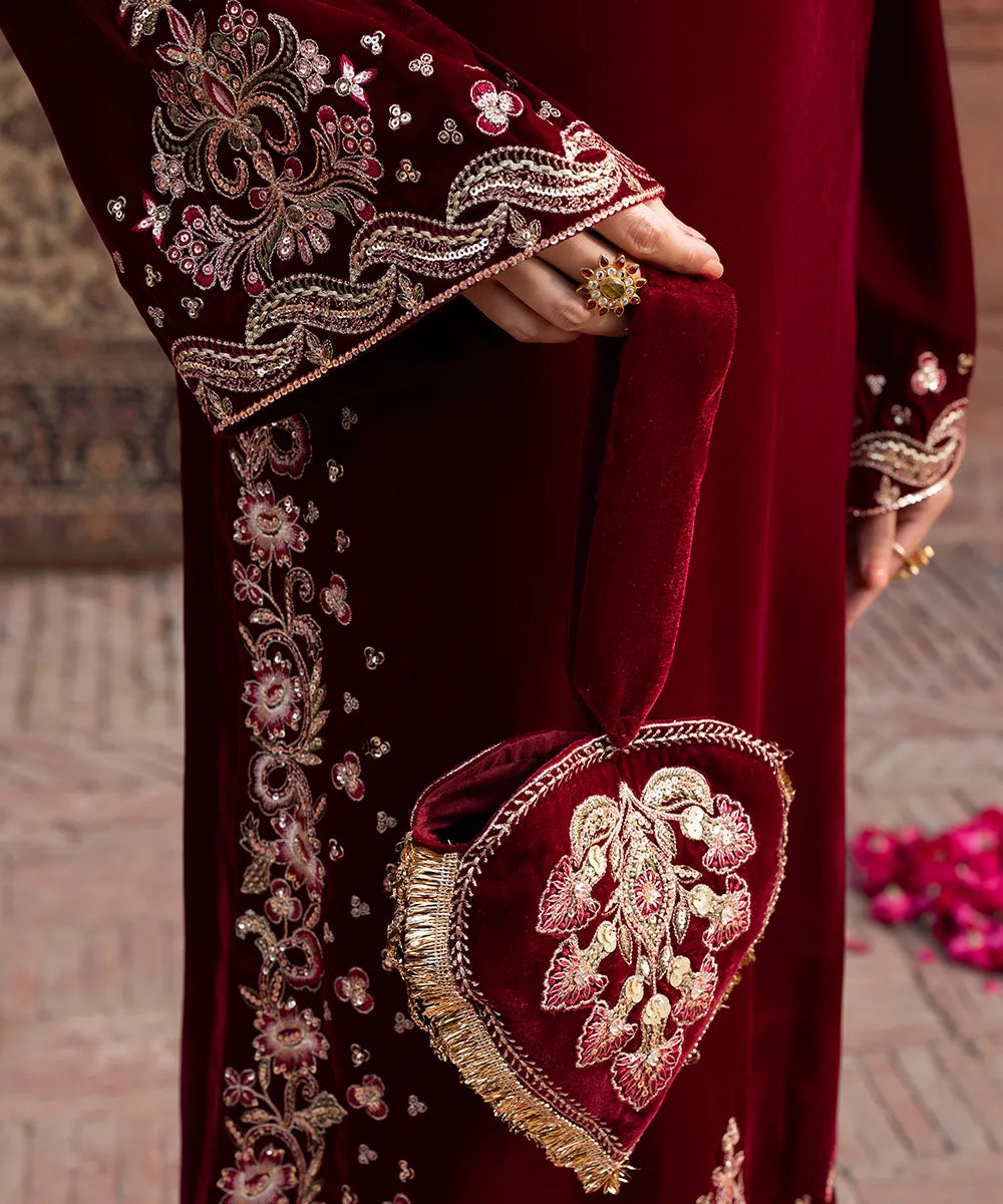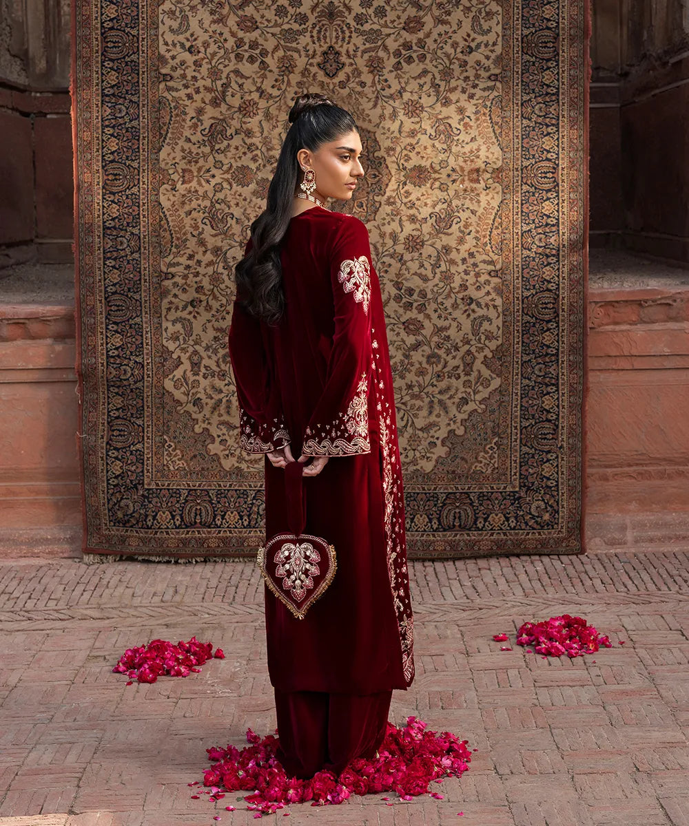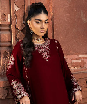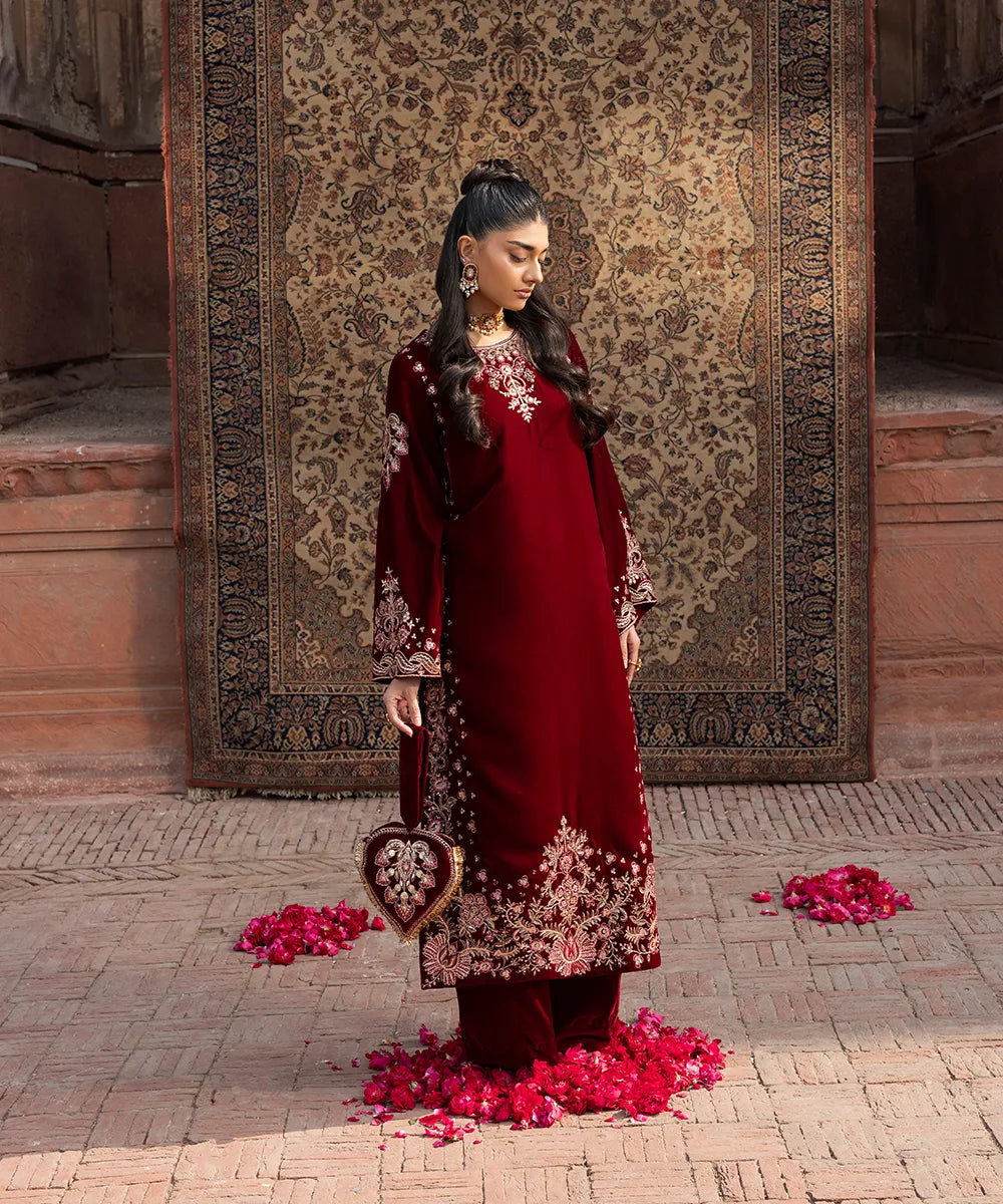 A maroon canvas in luxury velvet serves as a base to meticulously designed embroidery on the neckline, sleeves and side borders. The multi-colored threads are adroned with gold sequins. It is paired with a velvet straight trouser in maroon.