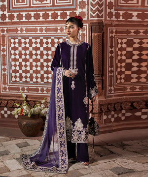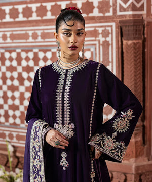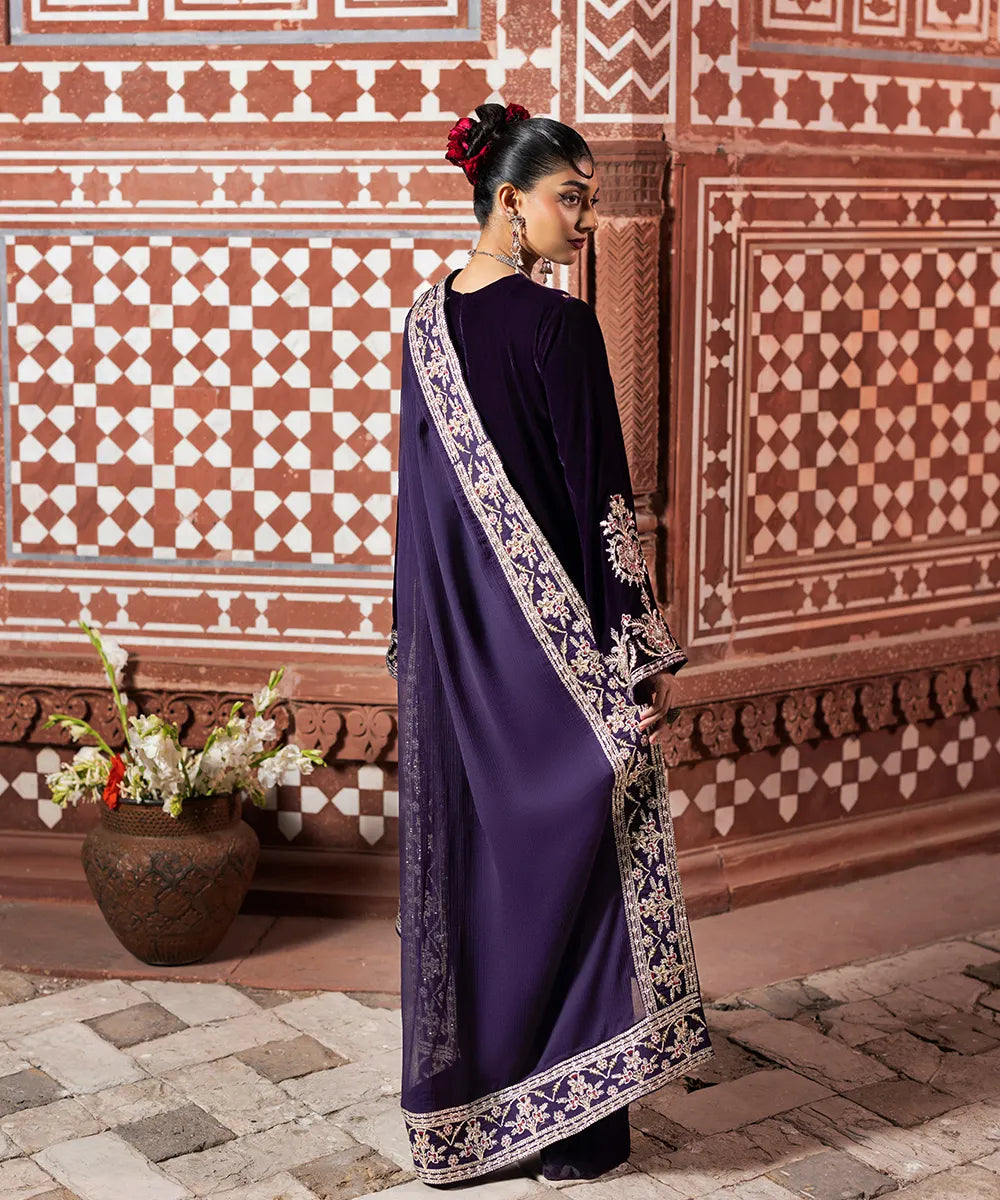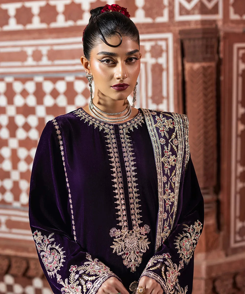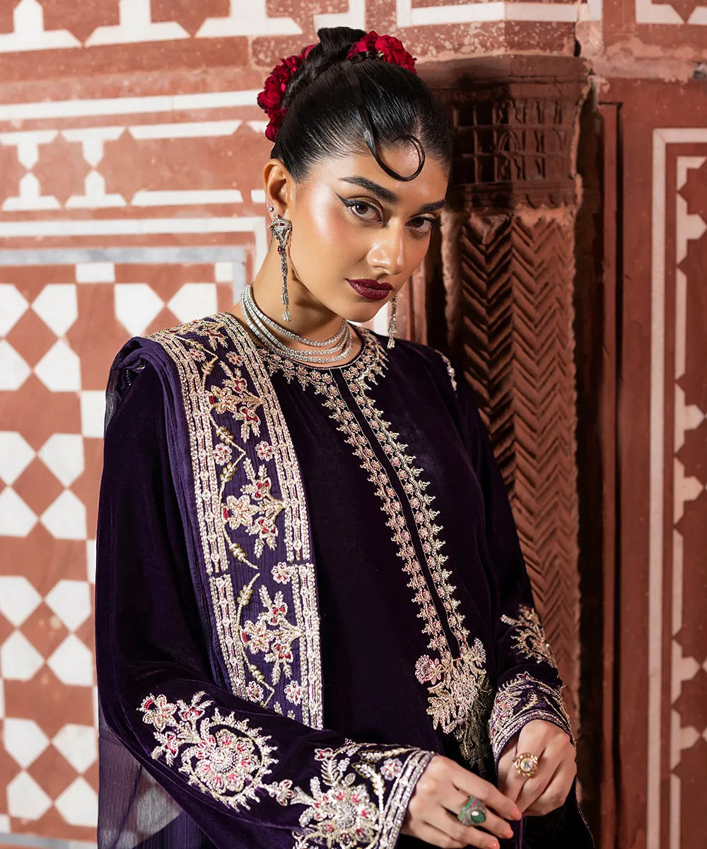A plum canvas in luxury velvet serves as a base to meticulously designed embroidery on the neckline and sleeves. The front has vines running down from the shoulder with gold sequins. It is paired with a velvet straight trouser and embroidered dupatta in plum.