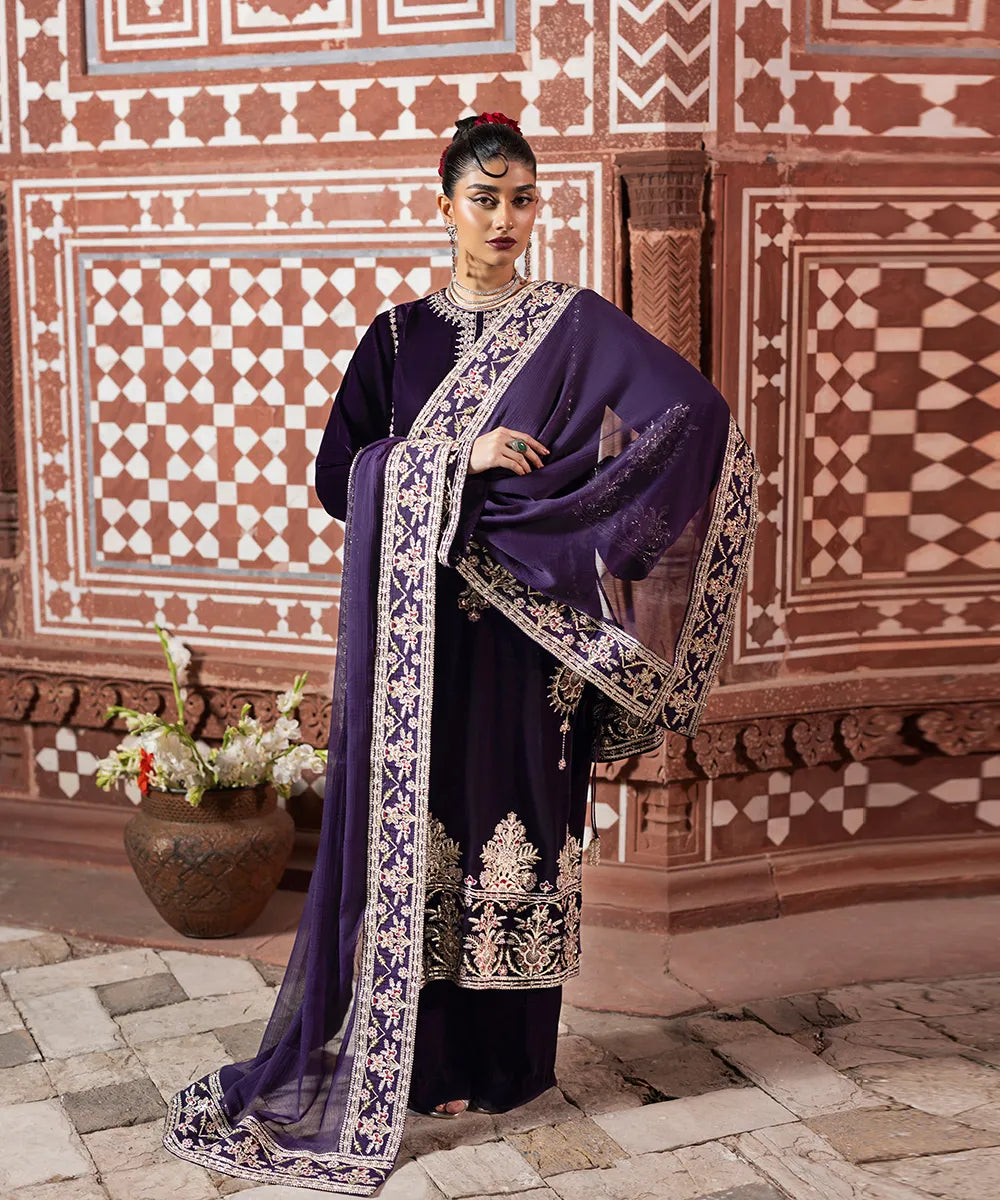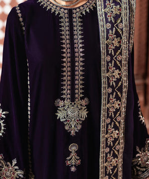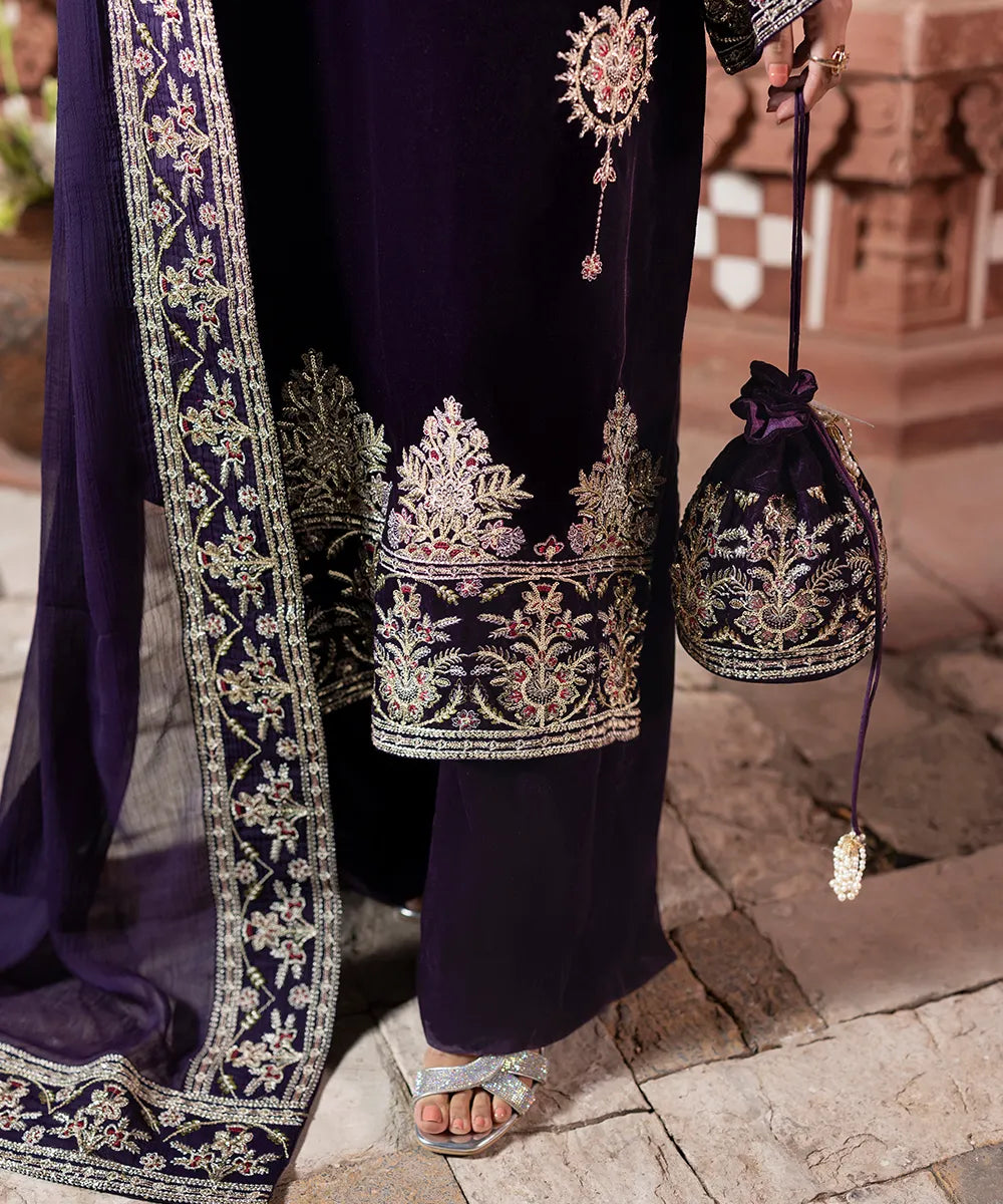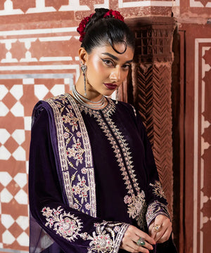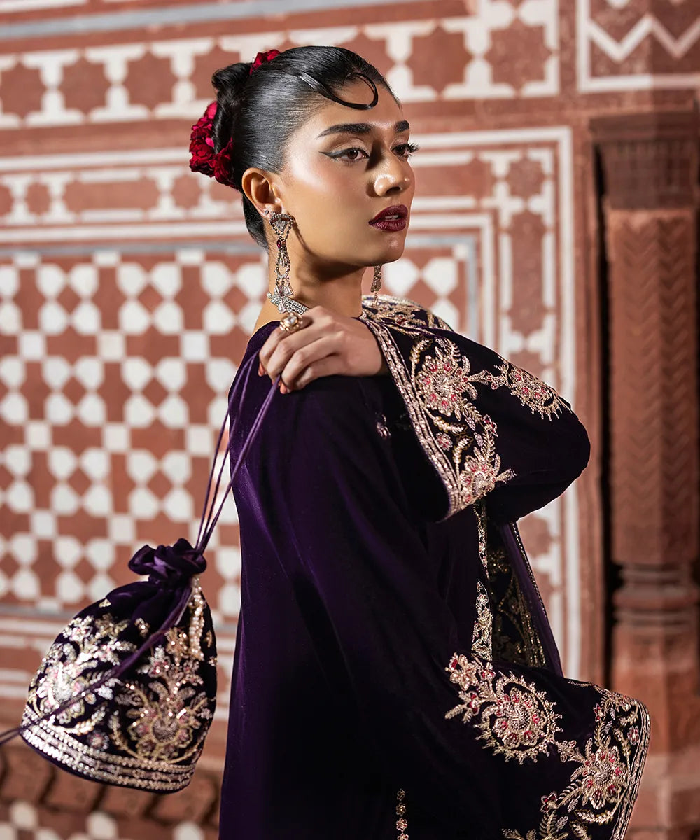 A plum canvas in luxury velvet serves as a base to meticulously designed embroidery on the neckline and sleeves. The front has vines running down from the shoulder with gold sequins. It is paired with a velvet straight trouser and embroidered dupatta in plum.