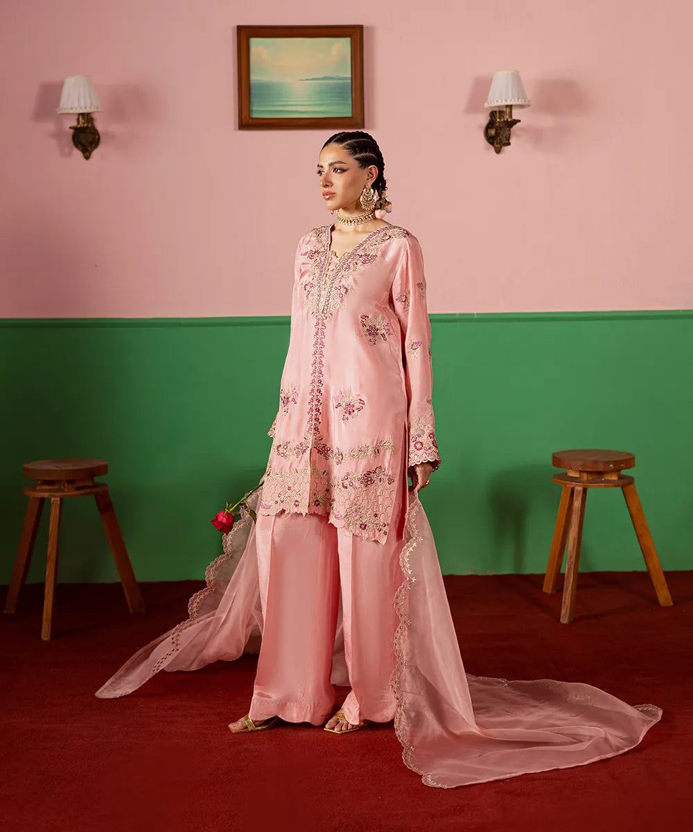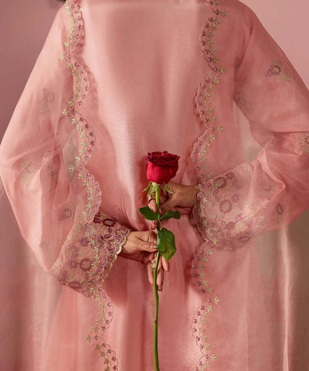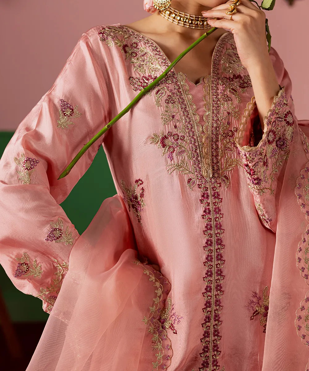 A lovely salmon pink silk jacket featuring intricate embroidery on the front and sleeves in hot pink and gold. It is paired with an embroidered dupatta with scallops and flared trousers.