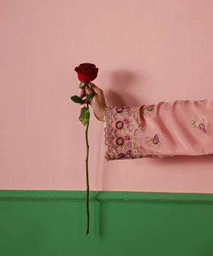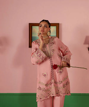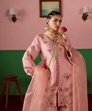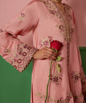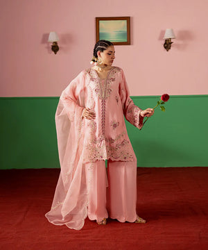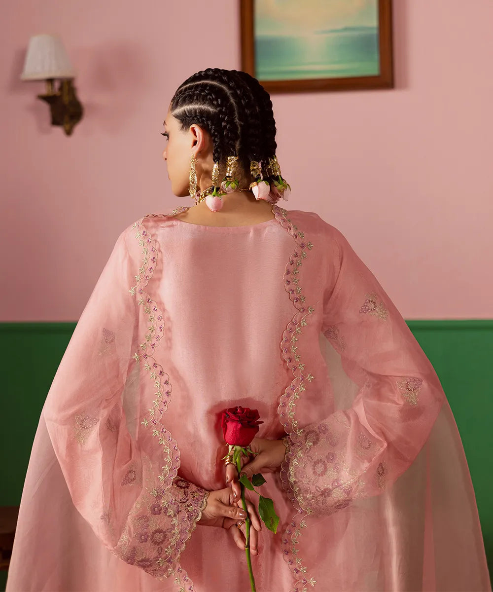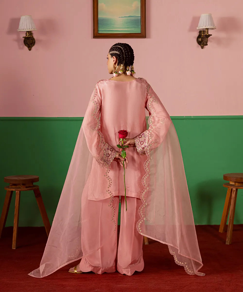 A lovely salmon pink silk jacket featuring intricate embroidery on the front and sleeves in hot pink and gold. It is paired with an embroidered dupatta with scallops and flared trousers.