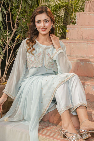 Top: Tiffany Blue Chiffon Koti + Kurta With Embroidery and Malai Crepe Lining