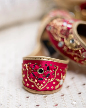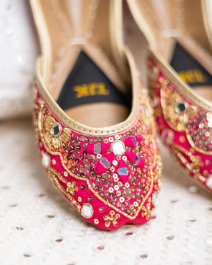 Revealing ?Aangan? Like the fresh bloom of spring, this khussa is decorated with vibrant embroidery, reflective sheesha accents, and delicate gold sequins. The lively design makes it an eye-catching statement piece for festive occasions.