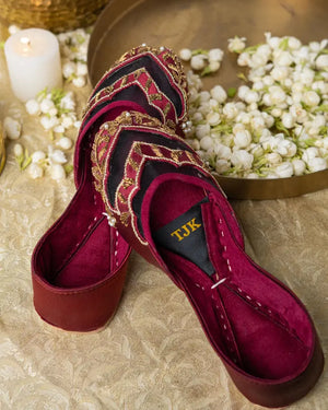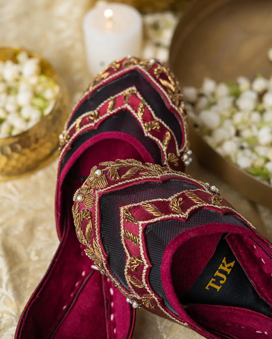 A rich maroon jutti adorned with intricate gold embroidery and elegant cutwork. This standout piece offers a regal touch, perfect for adding a festive flair to your wardrobe.