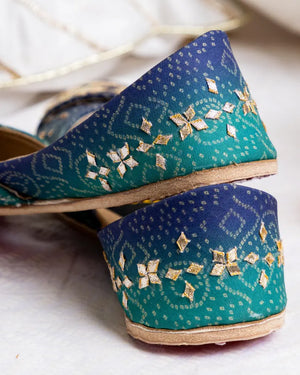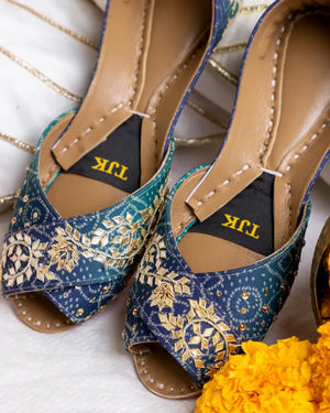 A fusion of heritage and contemporary style, the Adina Bloom Khussa is a handcrafted masterpiece featuring intricate zardozi and gota work on premium Ajrak fabric. The deep indigo and emerald green hues create an eye-catching contrast, making it the perfect choice for festive occasions, weddings, and cultural celebrations. Designed for both style and comfort, this khussa ensures a luxurious fit with its soft padded sole.