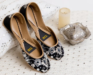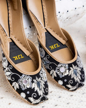 Introducing ?Almas? Shining like diamonds, this khussa is adorned with crystal beads, silver sequins, and intricate mirror embroidery. The glimmering details catch the light beautifully, making it a must-have for evening festivities and celebrations.