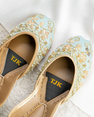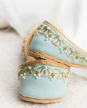 Step into timeless elegance with Aqua Gulaal, a mint blue handcrafted jutti adorned with intricate zari, pearls, and sequin embroidery. Perfect for weddings and festive soirées, this ethereal design blends tradition with subtle modernity. Comfort-lined and crafted to last, this pair adds a regal touch to your ethnic wardrobe.ÂÂ