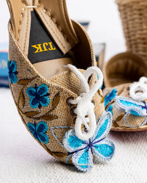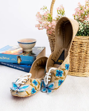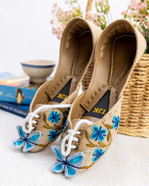 A statement piece, the Blue Monarch Khussa combines earthy tones with bold blue floral embroidery and 3D butterfly detailing. A perfect choice for those who love to stand out while staying rooted in tradition