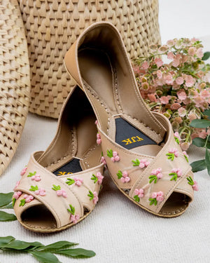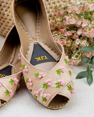 Feminine and delicate, the Blush Blossom Khussa is adorned with dainty pink rosebud embroidery on a nude-beige base. A dreamy pick for tea parties, lunches, or subtle festive styling, these khussas balance elegance with ease.