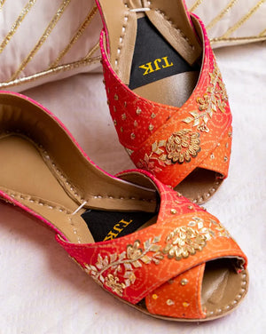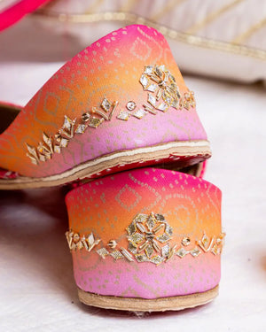 Infused with warmth and elegance, the Gaia Noor Khussa is a stunning combination of rich orange and deep pink hues. Traditional gold zardozi work enhances its artisanal beauty, while the soft padded sole ensures maximum comfort. This handcrafted pair is a must-have for mehndi, sangeet, and festive gatherings.