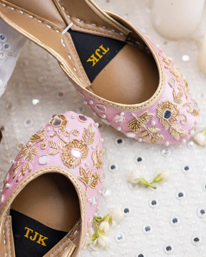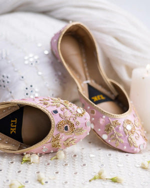 Featuring a delicate pink base with intricate gold embroidery and pearl accents, this design is a celebration of grace and femininity. Ideal for festive gatherings or adding a soft, elegant touch to your attire.