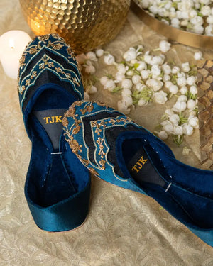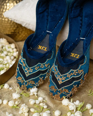 Featuring a bold teal hue with exquisite gold threadwork and scalloped designs, this jutti is a masterpiece of craftsmanship. Perfect for elevating your traditional attire with a touch of contemporary charm.