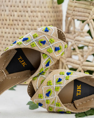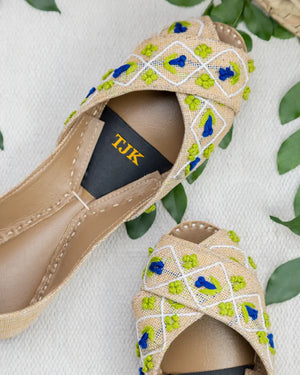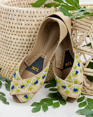 Fresh and playful, the Meadow Muse Khussa captures the joy of spring with its green and blue embroidered motifs on a neutral base. Lightweight and cushioned for all-day wear, these handmade khussas transition seamlessly from everyday outfits to festive gatherings. A must-have for women who love chic yet traditional footwear.