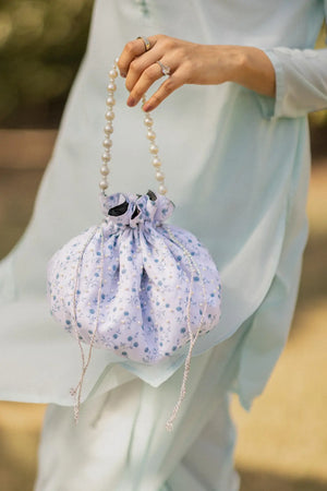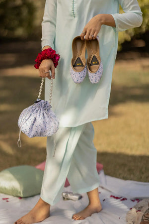 A dreamy pastel blue khussa and potli with delicate floral embroidery and pearl embellishments. The soft, romantic shade and intricate craftsmanship make it a must-have for special occasions.
