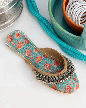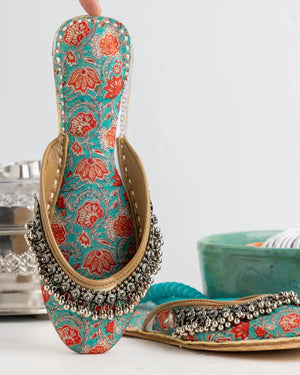 Mehfil is made for gatherings that turn into memories. Featuring hand-blocked red florals on a teal base and a signature Afghan anklet, it?s a modern take on classic Pakistani khussa elegance.