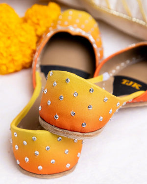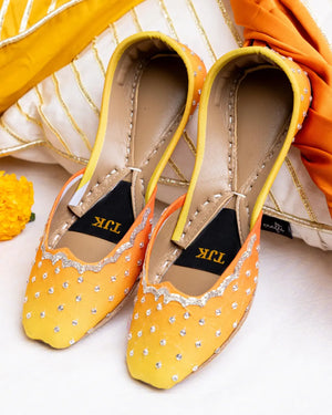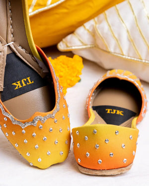 A warm transition from burnt orange to deep golden yellow, MehRaushni is inspired by the glow of henna-clad hands under wedding lights. Intricately handcrafted with silver embellishments, this khussa is a symbol of celebrations, traditions, and new beginnings.