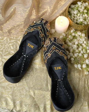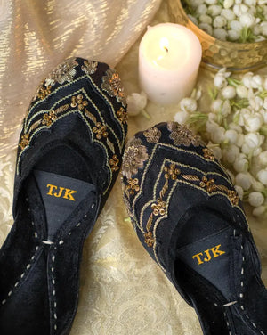 Crafted in classic black, this jutti features intricate gold embroidery and scalloped detailing, exuding sophistication and timeless elegance. Ideal for evening gatherings and festive occasions, it?s the epitome of understated luxury.
