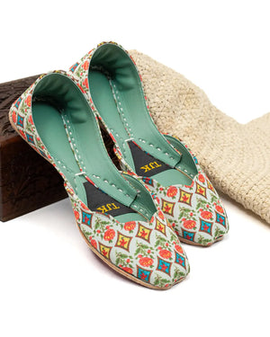 Vibrant and full of character, Noorani is a sea green jutti with a colorful mosaic print in orange, red, and gold. It?s a mood-lifting piece for celebrations or daily sparkle.