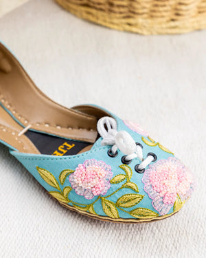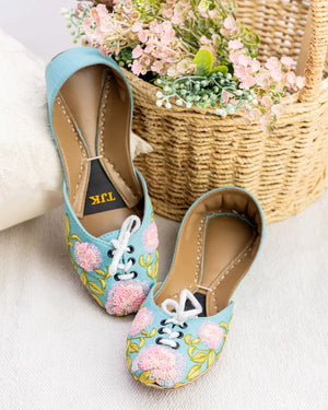 Light, cheerful, and effortlessly stylish ? the Peony Bloom Khussa is designed for your casual day-outs. Featuring pastel pink beaded peonies on a refreshing aqua base, this pair brings a pop of color to brunches, coffee dates, and weekend gatherings. Comfortable and handcrafted, it?s your everyday go-to with a touch of floral charm