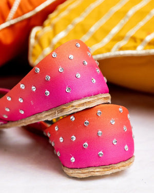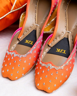 A cheerful blend of daisy yellow and tangerine orange, Rangbari is inspired by marigolds swaying in the courtyard breeze. This ombre beauty radiates joy, bringing warmth to your every step.