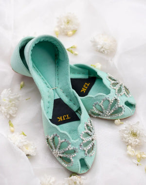 These pastel peep-toe juttis feature delicate butterfly-inspired pearl embellishments, exuding elegance and charm. Perfect for spring and summer, their soft hues and handcrafted comfort make them ideal for festive occasions or casual gatherings.
