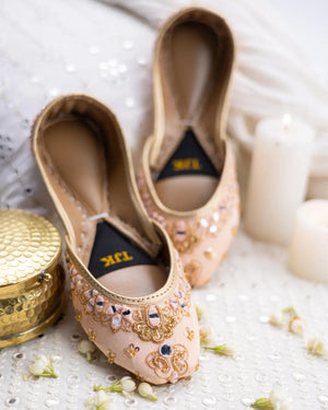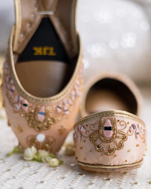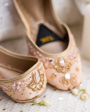 This peach-toned khussa features elaborate gold zari embroidery paired with pastel embellishments. It exudes warmth and sophistication, making it a versatile pick for both day and evening events.