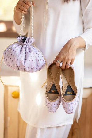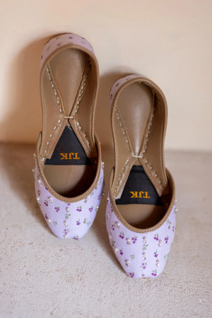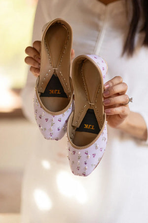 A delicate lilac-hued khussa featuring intricate floral embroidery with hints of silver and tiny embellishments. The soft pastel shade paired with traditional craftsmanship makes it an elegant and comfortable choice for festive occasions.