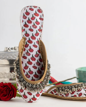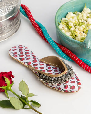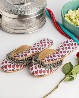 Discover Soraya, a timeless pair of handmade khussa shoes crafted with love. Featuring delicate red block prints on white fabric and Afghani-style embellishments, this traditional khussa blends culture with comfort. Ideal as a bridal khussa, for festive wear, or to elevate your everyday look.