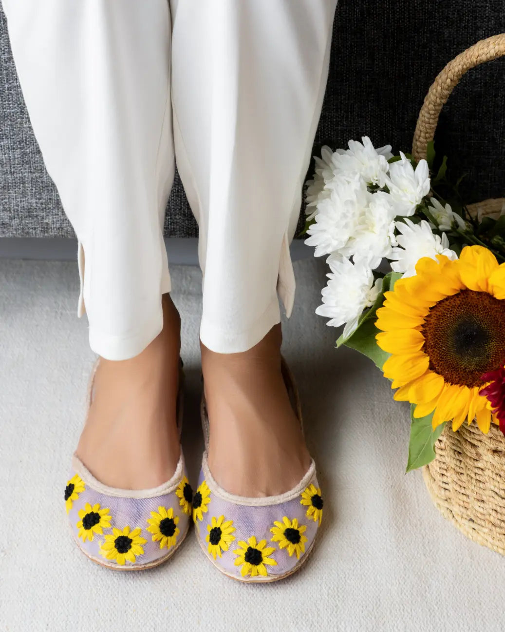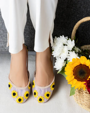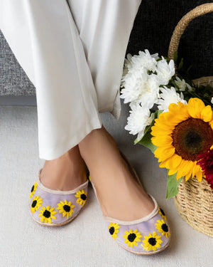 Brighten your day with Sunbeam, inspired by the warmth of golden sunflowers. Crafted on a sheer net base, these khussas radiate joy, optimism, and unmatched craftsmanship.