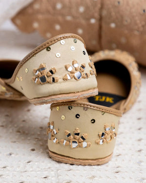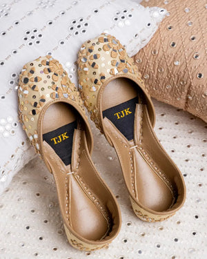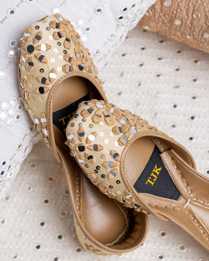 Meet ?Jahan Ara? Fit for a princess, this khussa blends traditional zari and sequins embroidery with subtle mirror embellishments, creating a design as regal as Jahan Ara herself. The rich craftsmanship and comfortable fit make it ideal for weddings, Eid, and festive gatherings.