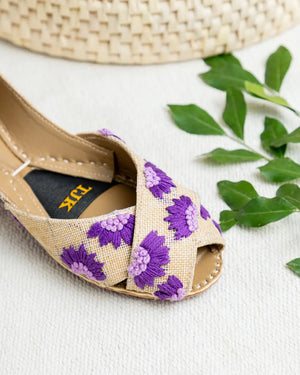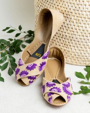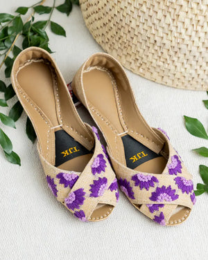 Bold yet graceful, the Violet Dusk Khussa showcases deep purple flowers embroidered on a jute-beige base. Its rustic vibe makes it the perfect match for casual denim, ethnic cottons, or boho-inspired looks.