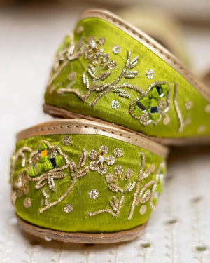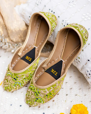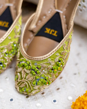 Meet ?Zamurrud? Inspired by the elegance of emeralds, this khussa features beaded detailing, sequins, and shimmering sheesha work, creating a jewel-like effect. Each handcrafted element exudes a regal aura, perfect for those who love heritage craftsmanship.
